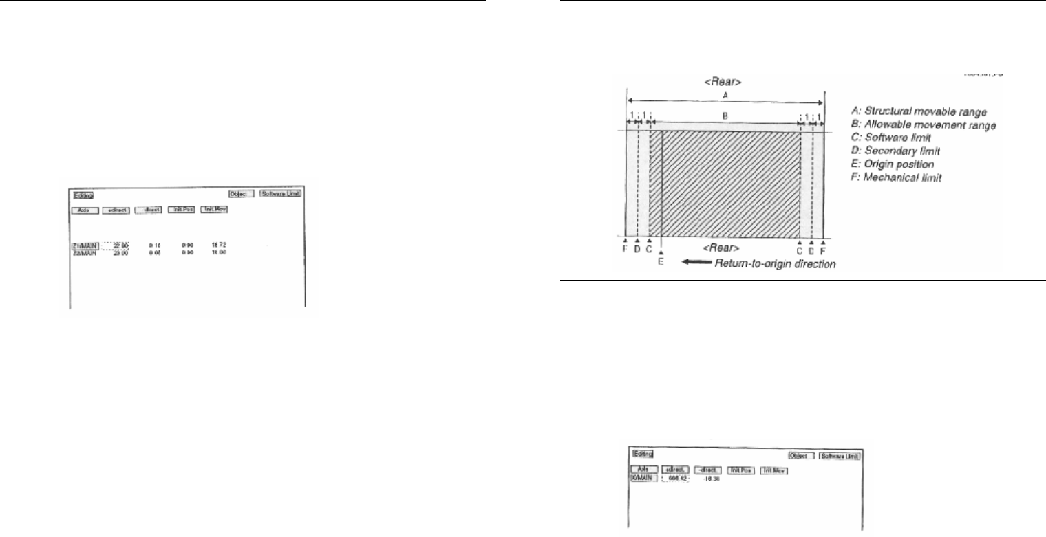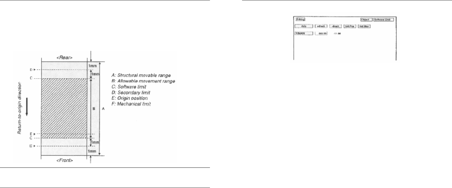 第 三章 调整 3 - 123 (如 取 消 保 存 ,可选 择 < B 3 R E C O V E R AD J U S T> 或 < B 7 Q U I T> 并 按 回车 键。 6.3.4. 调整 Y 轴 软 限 位 与 X 轴一 样 , Y 轴 软 限 位 应 设 为 正 负 方向 的第 二 限 位向 内 1.00 mm 位 置。 X 轴移动 范围 注意 根 据调整第 二 限 位 时 所 记 录 第 二 …