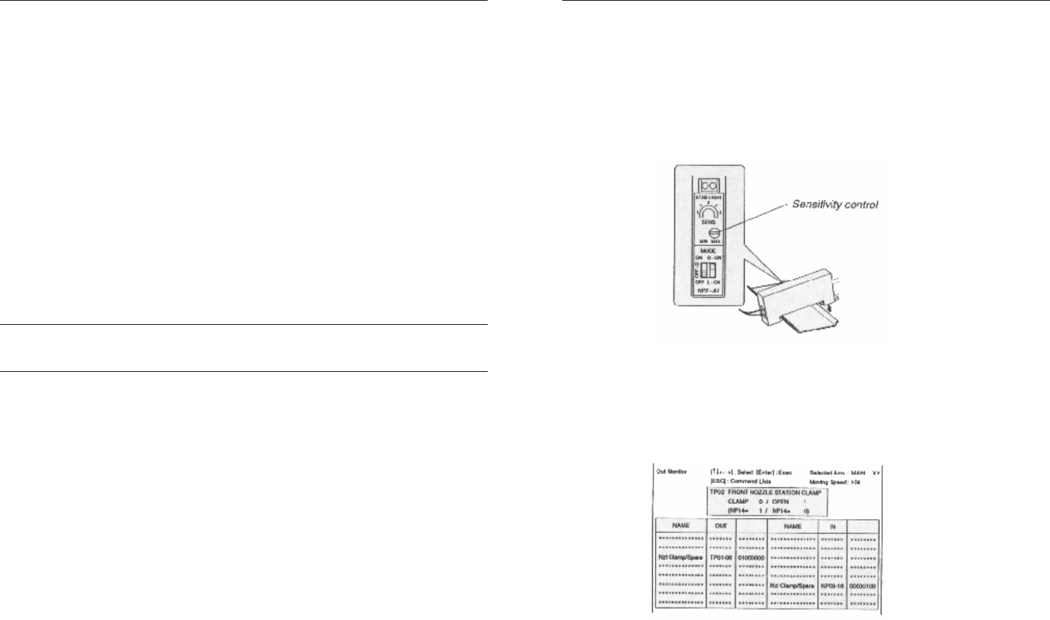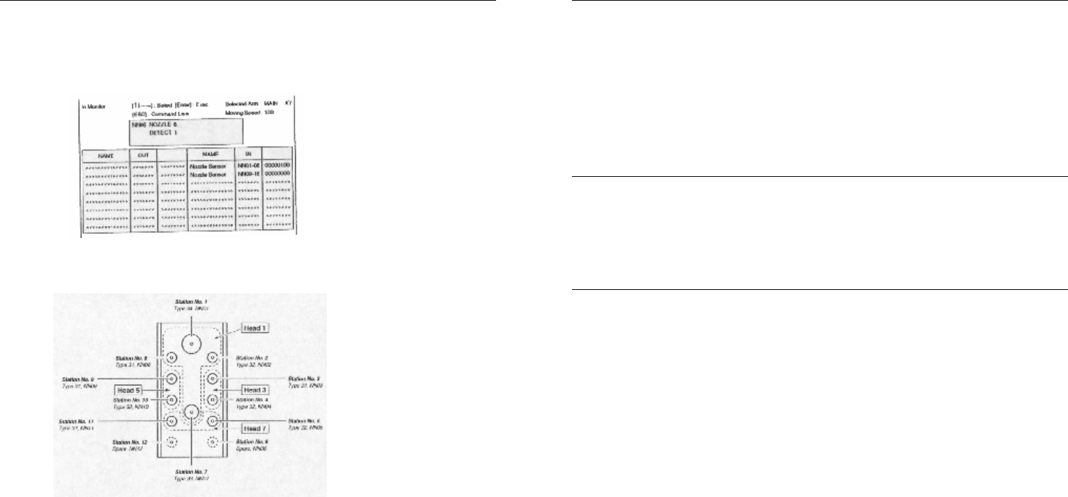 第 三章 调整 3 - 133 确 保 放 入 正确 的 吸嘴 。 第三步 打开输入监示 窗选 择吸嘴 传 感器。 1 . 按 [ T A B] 键 移动光标至输 入监 示 窗 。 2 . 移动光标至 “ N N 01 ” 至 “ NN 16 ” 中 相 应 的数 字 。 欲 检查 吸 嘴位 置 号 与 传感 器的 对 应 , 见下 图 。 l 换嘴 站 号 第 三章 调整 3 - 134 第 四 步 检查选定的传 感 器的输入 状态 …