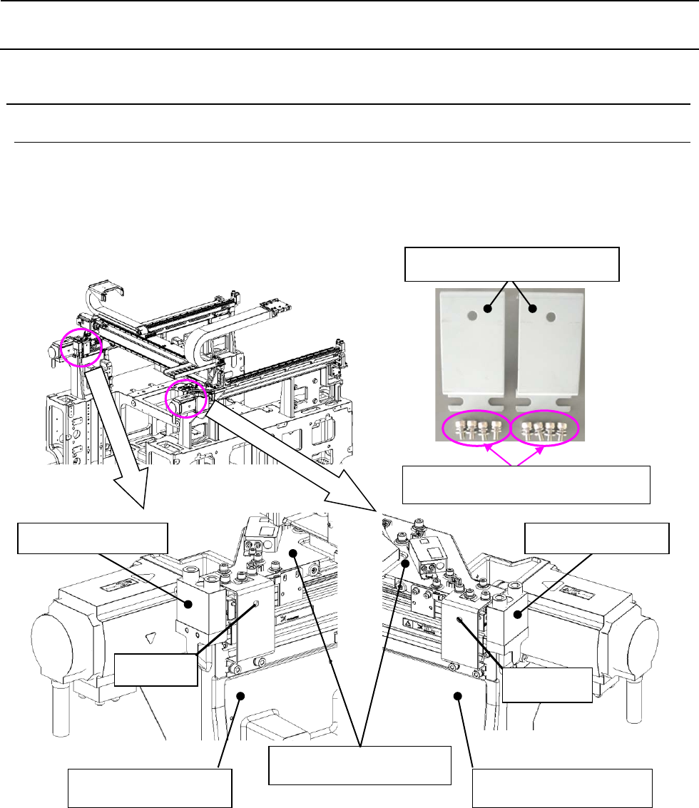 包装要领书 2-2 2- 2 贴片头部分的固定 1) 把安装注意标签(黄色,货号: 40087186 )装在 X_FIX_BR 的螺丝安装长孔部。 2) 把 Head 移动到最左面(从背侧看),抵住 X 限动器橡皮。 3) 在此状态下,用 X_FIX_BR 固定 HEAD_TOP_BASE 和 X 轴框架。 把限动器橡皮粘贴在 X_FIX_BR 上,顶住 HEAD_TOP_BASE 后予以固定。 橡皮的粘贴面请用酒精进行脱脂。 SCR …