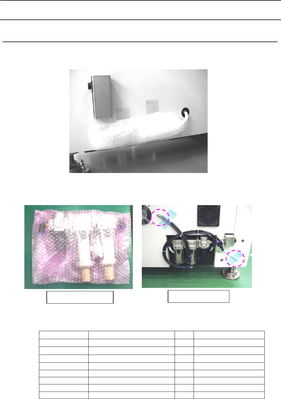 包装要领书 8-1 第 8 章 电动式固定台架 仅电动式固定台架规格须要实施本作业。 8- 1 包装零部件的卸下 卸下以下组装在机器主机体上的装置和零件。各个安装螺丝要与零件包装在一起。 8- 2 包装方法 ① 固定规格的录像带固定器应固定在布满在主体组装空气帽纤维丝胶带。 卷盘架组件 废料箱 图 8-1-1