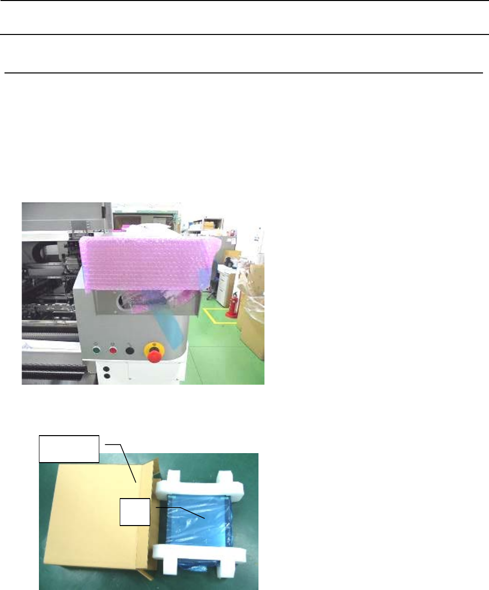 包装要领书 10 - 1 第 10 章 主机整体 ① 请把下一页中的标签纸粘貼在护罩上面之下图所示的部分。( 4 处。可黑白打印。) ② 用聚氯乙稀塑料把机器整体包起来。 聚氯乙稀塑料布尺寸∶ 2,200×1,600×1,560 (横宽 × 进深×高) t 0.05 (厚度) 跳线连接器 ※捆包时, 应在连接了 MTS 连接部的跳线连接 器的状态下进行捆包。