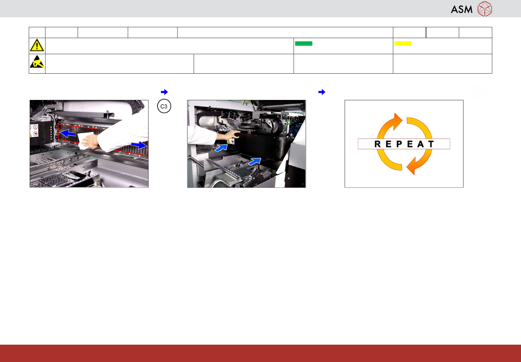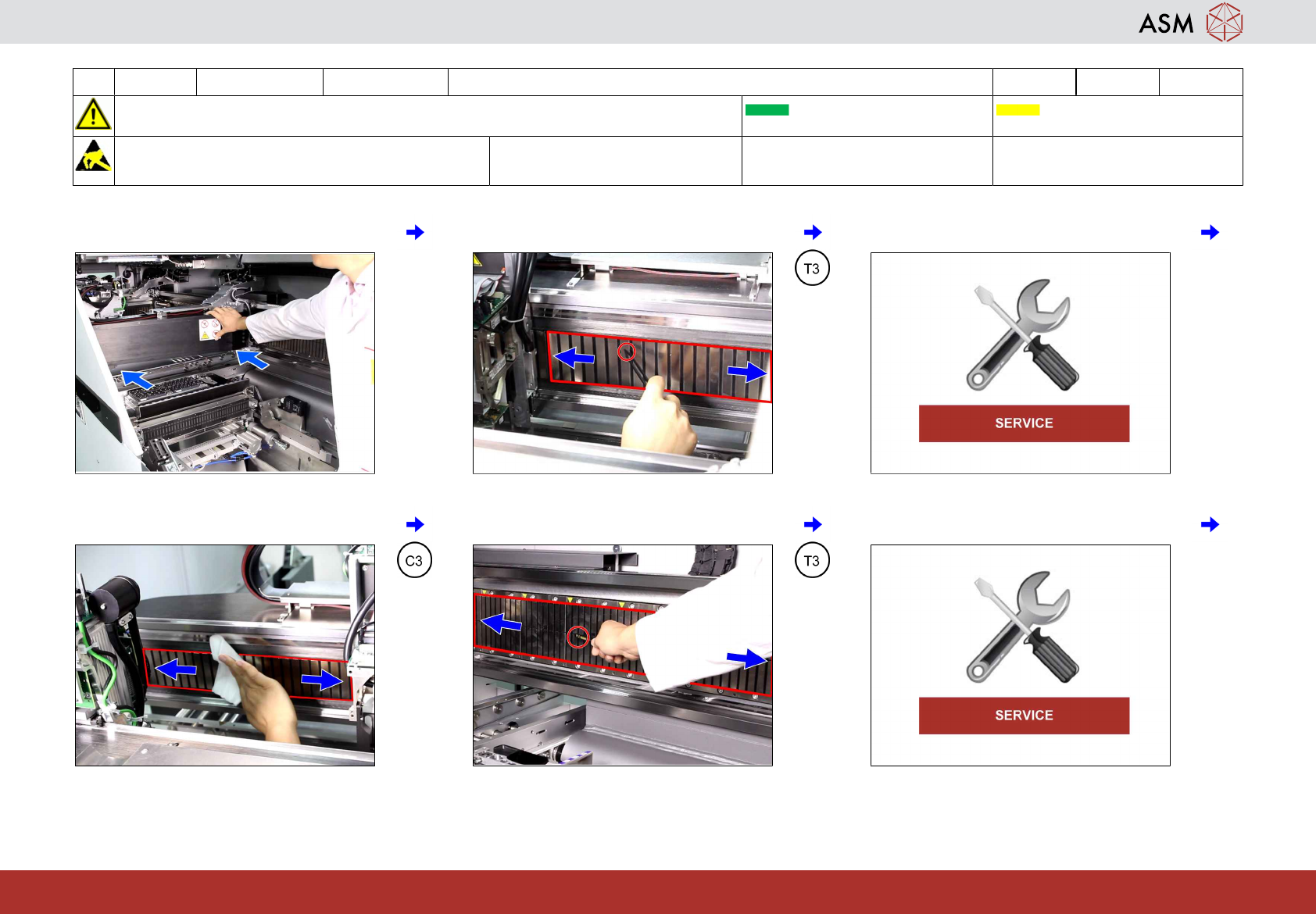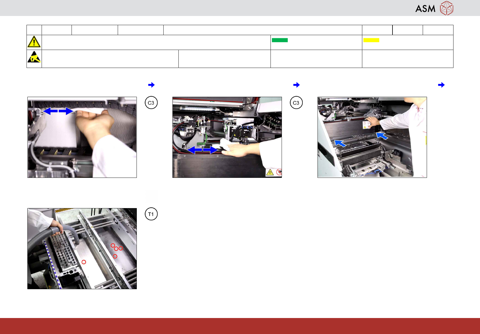 4 WF 1 TX 系列 维护 检查并清洁 X 与 Y 轴的磁性表面 4分钟 2 / 2 注 意 开 始 维 护 前 , 请 参 阅 用 户 手 册 中 的 安 全 说 明 贴片机状态开启 传送导轨空 注意!遵守防静电守则 工具: T3 易损件: 耗材: C3 www.asm-smt.com 7 如果正常,则清洁 Y 轴磁铁。 8 将悬臂移到极限位 2 上。 9 为其他悬臂重复第 2-8 步。
