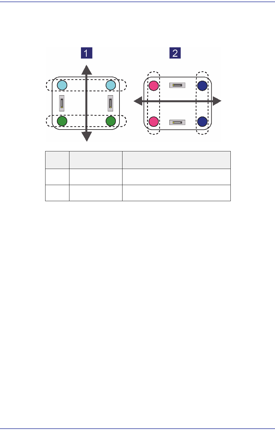 7-5 设备安装操作步骤 4. 调整设备 Foot 水平时, 建议两个 Foot 为 一组一次调整在一个方向上的水 平, 如 下图所示 : 图 7.1 调整量设备间水平 (Leveling) 5. 设备的 Foot 应在地板面上以均匀的压力加 以支持。 Foot 的 螺母的 锁压力应调节 到 Foot 受力一致, 并确认 Foot 是否 松动。 完成 level 调整后, 一定 要拧紧锁定 螺 母。 No. 水平调节 作业方法 1 左右…