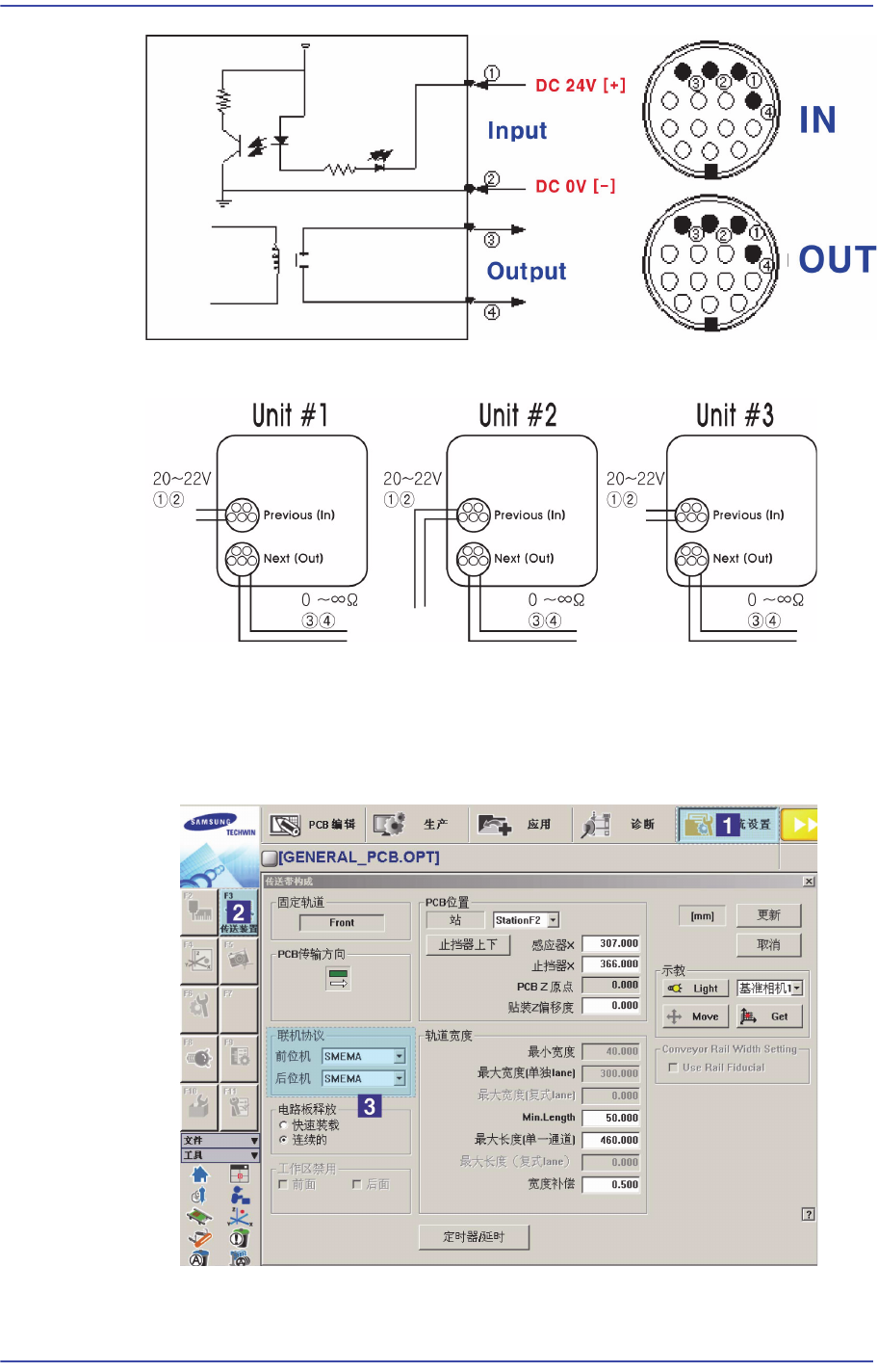 7-21 设备安装操作步骤 7.1.7. 设置设备间的通信 Interface 参照以下事项检查前一步和后一 步过程的设备间的通信界面 (interface) ST AR T 输入信号 (Cable No.: ① (+), ② (-)) 输入信号是从下一步过程设备输出 的, 大部分信号端子测量 出的电压大致为 20 ~ 22V 。 READY 输出信号 (Cable No.: ③ , ④ ) 输出信号是从全部过程设备输出的 , …