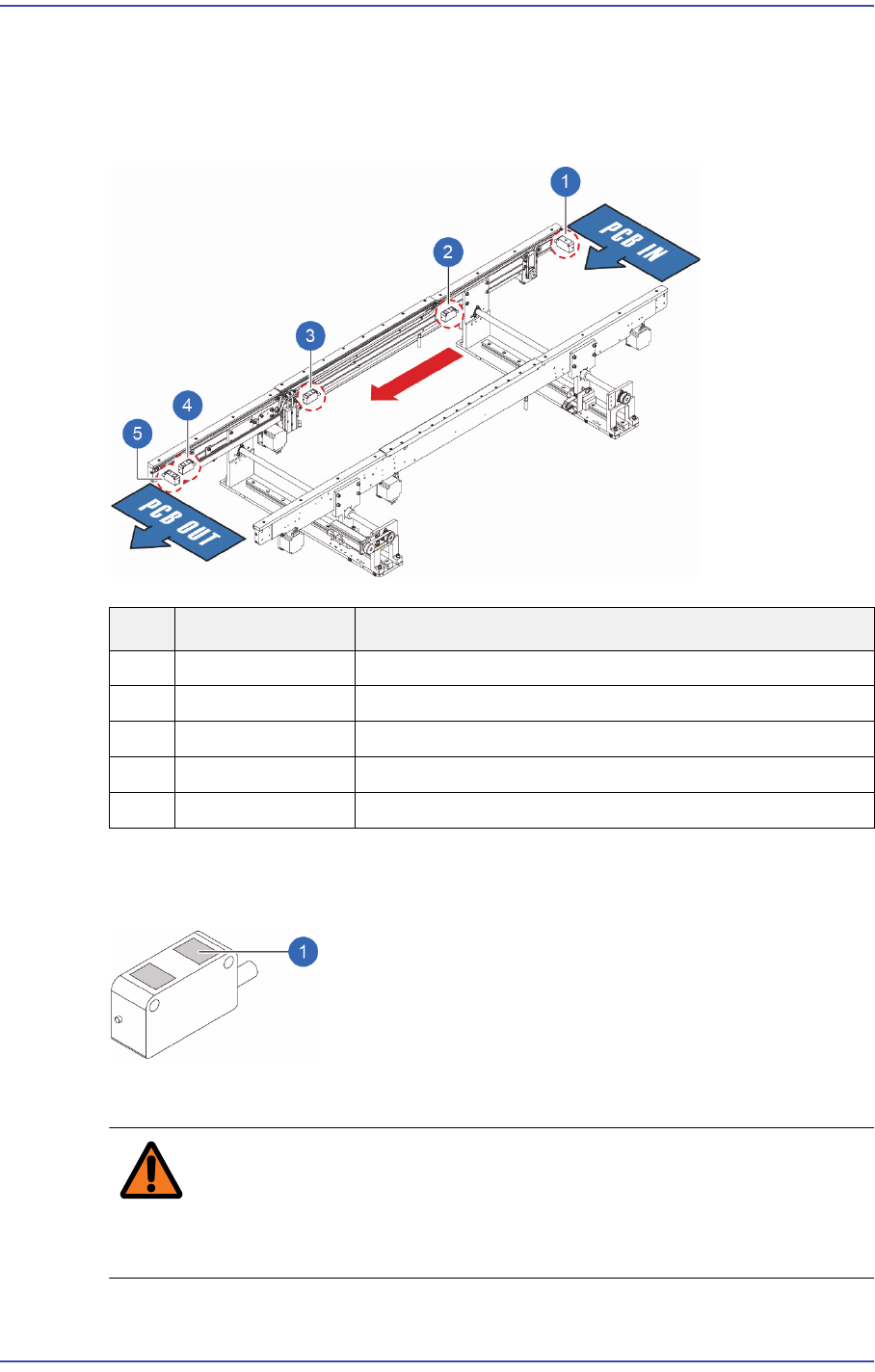 传送装置(Conveyor)的PCB输入/ 输出路径上安装了4个 PCB 的感应传感器。