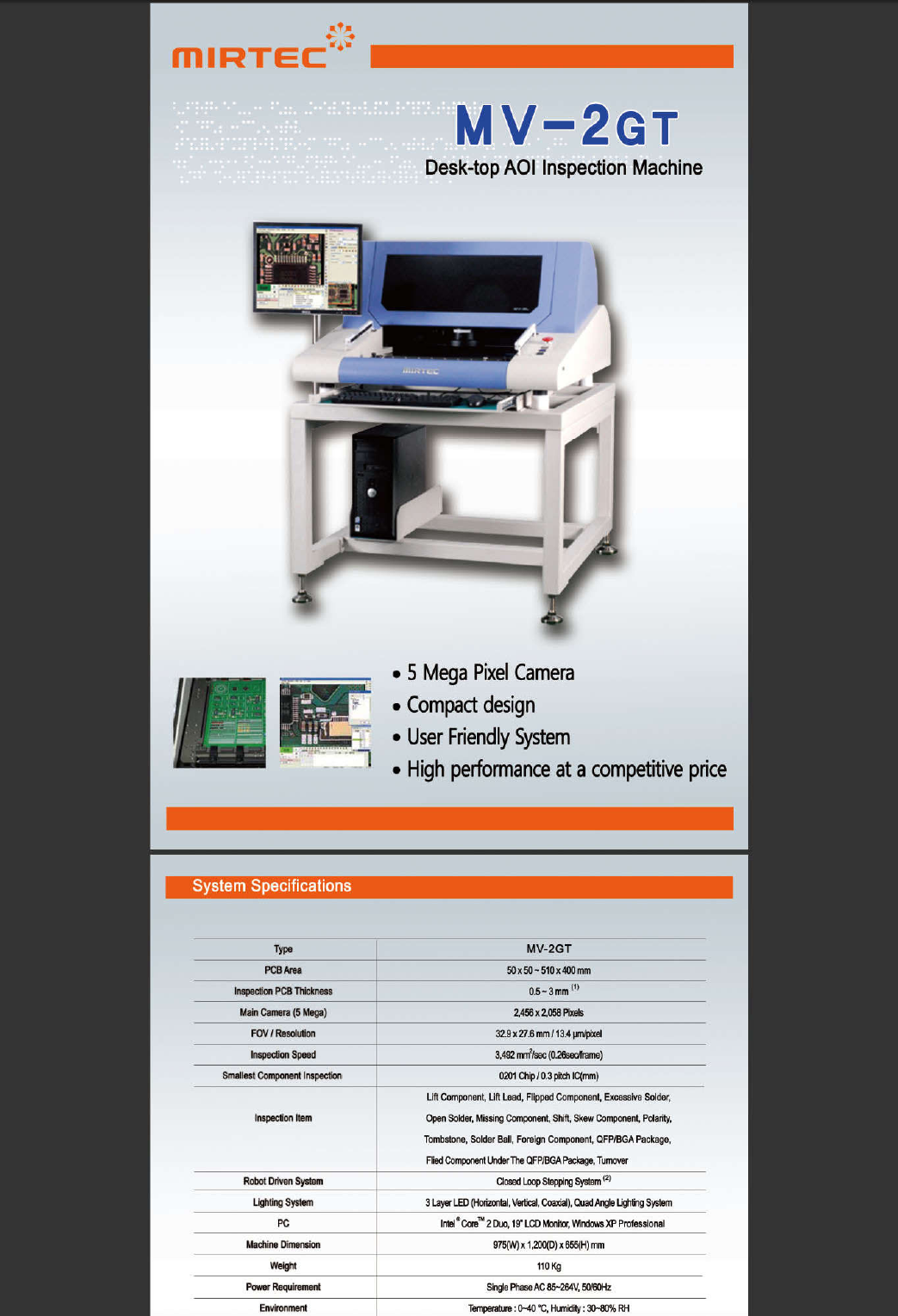M V - 2 G T Desk - top AOI Inspection Machine 1 J r • 5 Mega Pixel Camera • Compact design • User Friendly System • High performance at a competitive price System Specifications MV - 2 GT Type PCBArea 50 x 50 - 510 x 400…