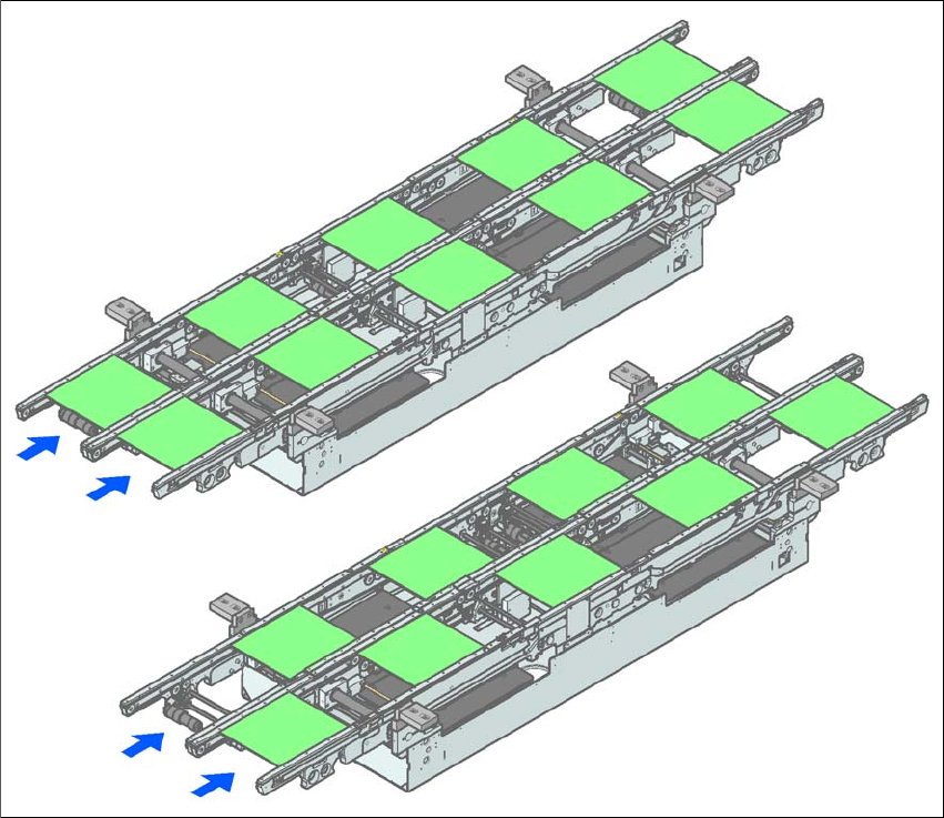 Leiterplatten auf den Transportspuren 1 und 2 werden synchron (d.h. die Transportbänder sind