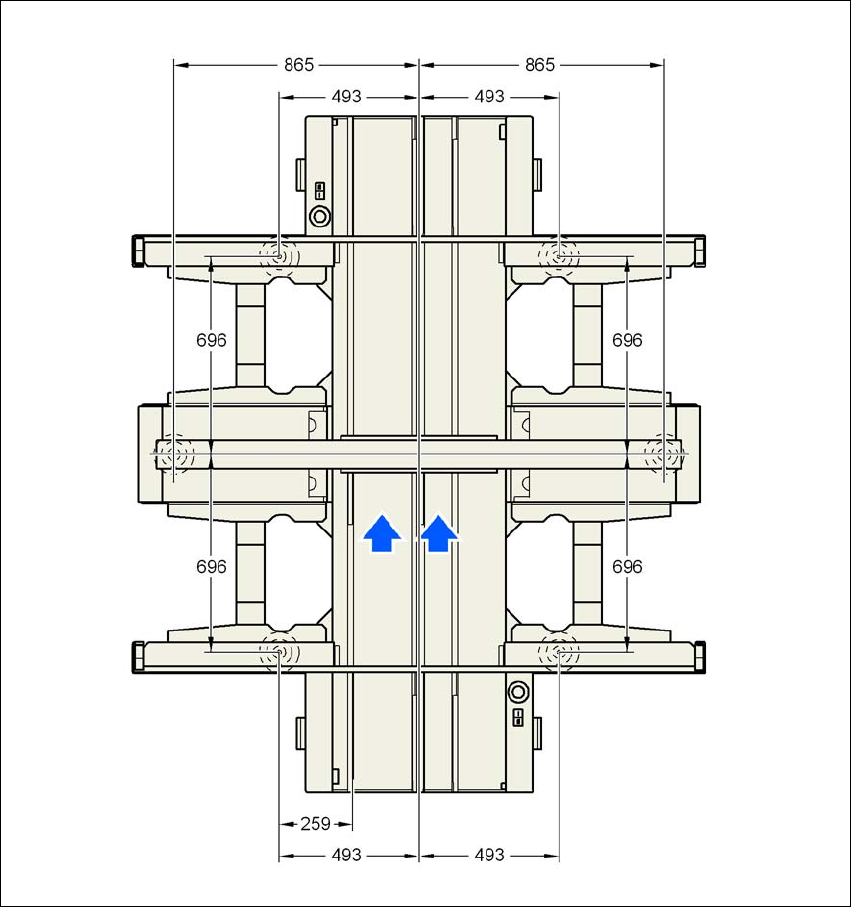 Abb. 4.3 - 5 Abstandsmaße der Maschinenfüße und der festen rechten Transportkante des LP-Doppeltransports