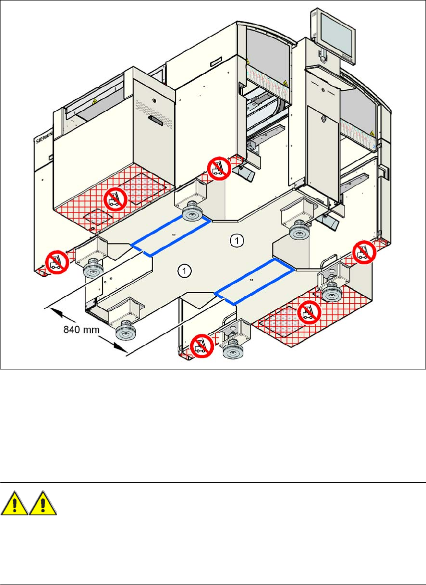 4 Aufstellen und Inbetriebnahme Betriebsanleitung SIPLACE D4 4.3 Den Automaten aufstellen Ab Softwareversion SR.605.xx Ausgabe 07/2008 DE 176 4 Abb. 4.3 - 7 Auflageflächen - Gabel quer zur Leiterplatten-T ransportrichtun…
