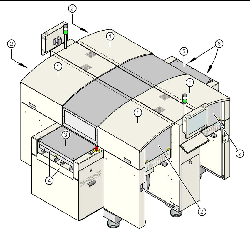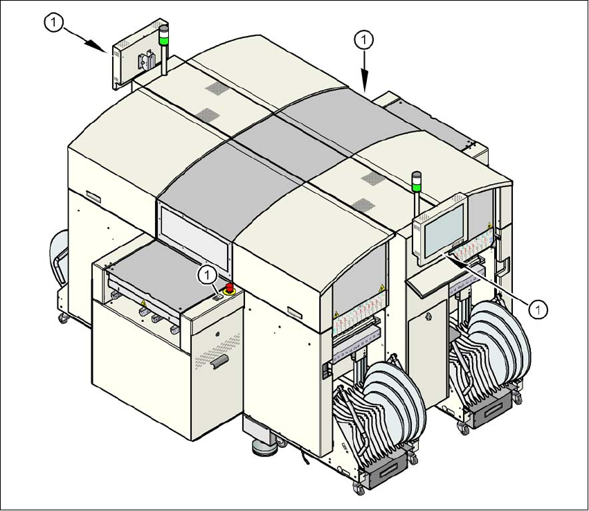 2 Betriebssicherheit Betriebsanleitung SIPLACE D4 2.6 Sicherheitseinrichtungen Ab Softwareversion SR.605.xx Ausgabe 07/2008 DE 58 2.6 Sicherheit s einrichtungen 2.6.1 Schutzhauben 2 Abb. 2.6 - 1 Schutzhauben (1) Schutzh …