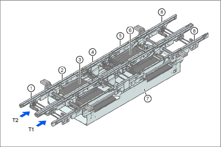 Betriebsanleitung SIPLACE D4 3 Technische Daten des Automaten Ab Softwareversion SR.605.xx Ausgabe 07/2008 DE 3.7 LP-Transportsystem 105 3.7.1.2 Aufbau des LP-Doppeltransport s 3 Abb. 3.7 - 2 Aufbau des LP-Doppeltranspor…