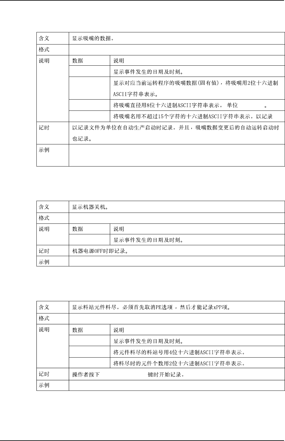 第 3 章 生产信息的显示功能 第 2 部 XP-141E 系统手册 2-3-30 Edition 1.0 xP A TimeStamp Device Nozzle xPA:0C2238:00010001 4 ASCII 4 ASCII xPA:<TimeStamp>:<Device><Nozzle> XP1S2092CM xMB TimeStamp BlockCount xMB:0C2238:05 …