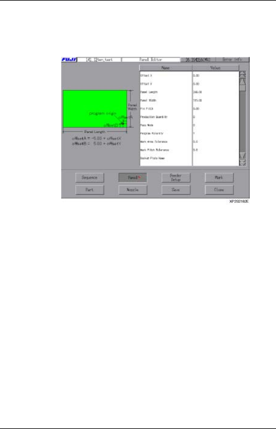 第 3 部 第 3 章 编辑器 Edition 1.0 3-3-9 XP-141E 系统手册 3.3 电路板编辑 电路板数据编辑器用于编辑贴装元件的 电路板信息。 项目说明 Offset X 以顺序输入的坐标的基准点与 FUJ I 的程序坐标原点 ( 从电路板右下角开始在 X 方向为 -5mm 、 Y 方向 为 +5mm 的坐标 ) 不同时, 有必要输入修正值。 请输入从电路板 上 FUJI 的原点到输入坐标数据的基准点的 X 方向的修…