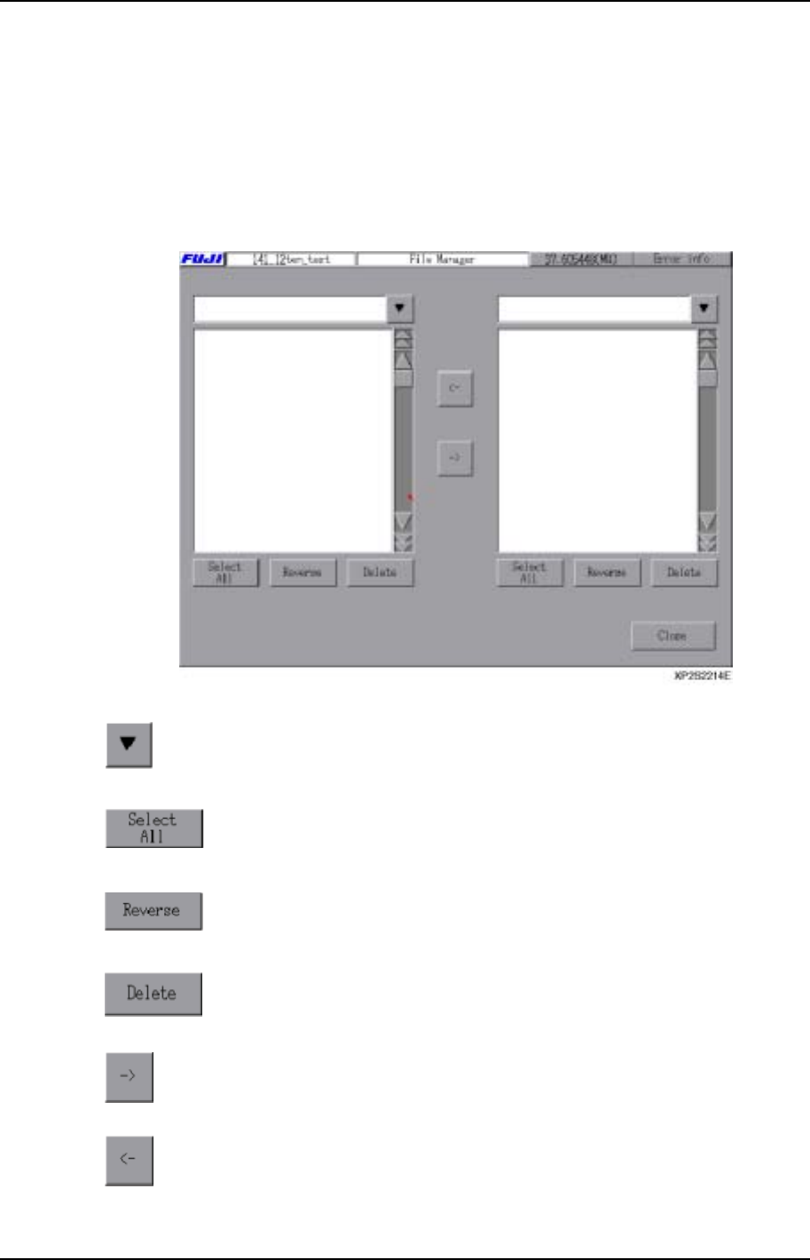 第 3 部 第 6 章 文件操作 Edition 1.0 3-6-1 XP-141E 系统手册 6. 文件操作 文件操作是在机器上创建的生产程序和元件数据文件复制到软盘中或删除无用文件时使用。此外,也可 在软盘中保存、将复制的文件复制到 机器中。 注意:如果复制的文件名称与已有文件名称相 同,则会以改写形式保 存。请确认文件名后再复制。 操作按键说明 按此键显示文件类型的目录。 按此键选择所有显示的文件类型。 按此键选择未被选择的文件。…
