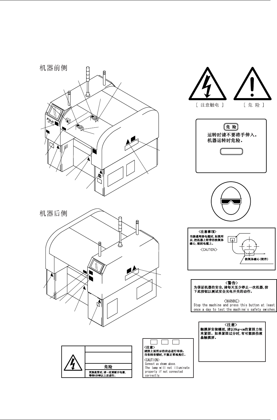 表示使用机器时的注意事项的标示牌贴在本机器的如下图所示的位置,请仔细阅读,确保安