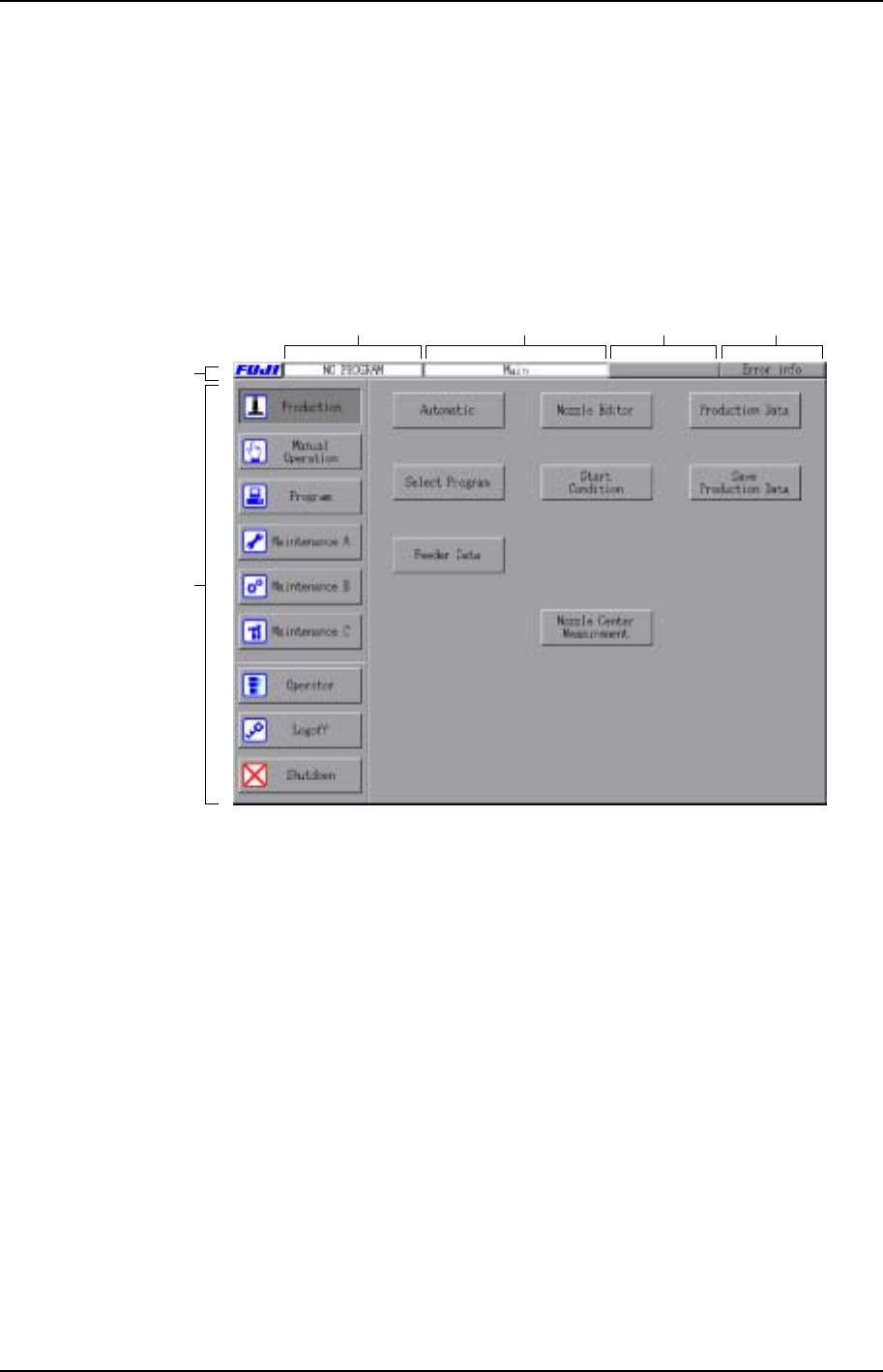 第 1 部 第 1 章 机器 Edition 1.0 1-1-3 XP-141E 系统手册 1.2 触摸屏阅读方法·使用方法 操作者可以从位于机器的前方或者后 方的触摸屏上向机器发送操作指令 。 在触摸屏上显示的 各种画面都包含了一系列的操作指令 键, 触摸指令键后显示与其指令相关的指令, 在某些画 面里,将操作指令键用不同的群组分 开进行表示。 下面的插图是为了解释画面的各项功 能的。 另外, 有关操作指令体系, 详细情况请参考本手 …