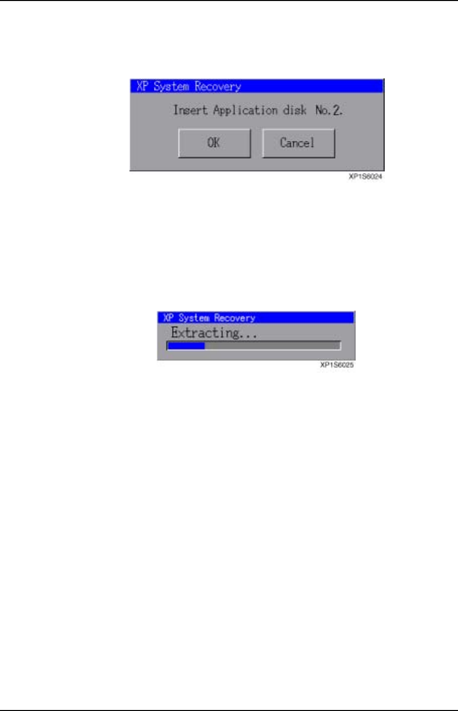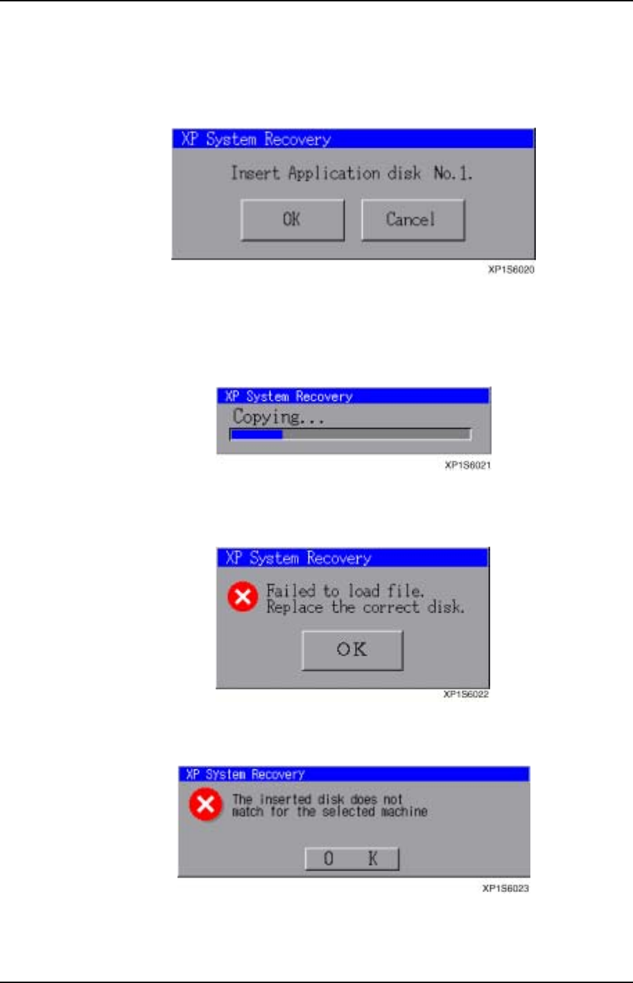 第 3 章 用复位盘进行系统复位 第 8 部 XP-141E 系统手册 8-3-4 Edition 1.0 2. 当对话框要求插入第 1 张应用盘时,请把第 1 张应用盘插 入机器 注意 : 在版本更新时或机器重新设置时,请使用 这张应用盘。 E 单击 [OK] 键开始复制文件 单击 [Cancel] 键停止复位处理并关机。 3. 如果插入正确的应用盘时,开始复制文件,显示出以下对话框。 E 如果未插入正确的盘 ( 第 1 张应 用盘 …