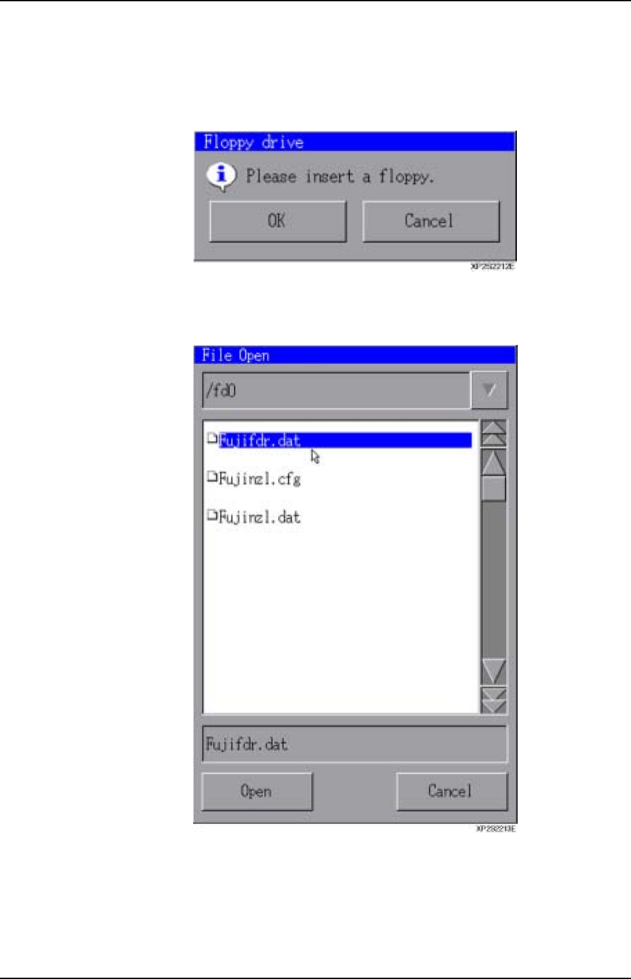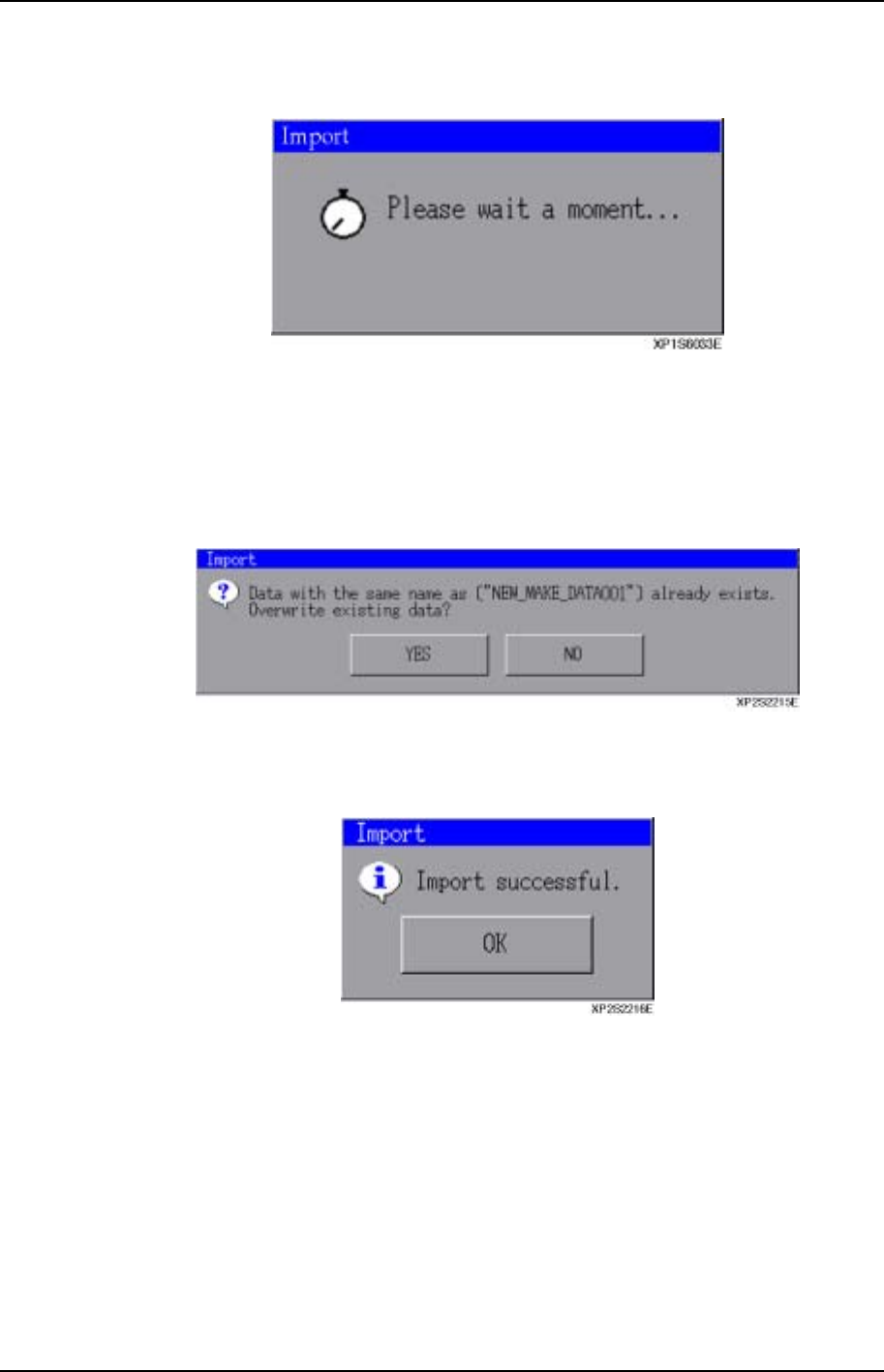 第 4 章 规格数据管理功能 第 8 部 XP-141E 系统手册 8 -4-2 Edition 1.0 2. 将写有输入文件的软盘插入软盘驱动器 后,单击 [Import] 键。 3. 在插入软盘的确认对话框中,单击 [OK] 键。 4. 显示出选择数据文件的对话框后,选择 要输入的文件,单击 [Open] 键。