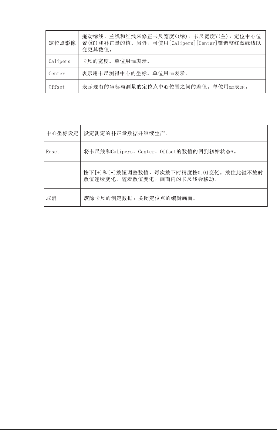 第 2 部第 2 章 定位点的编辑功能 Edition 1.0 2-2-3 XP-141E 系统手册 显示: XP1S2146CM 按钮: +, - XP1S2147CM * : 卡尺宽度的初期状态是当前已测量的数值。