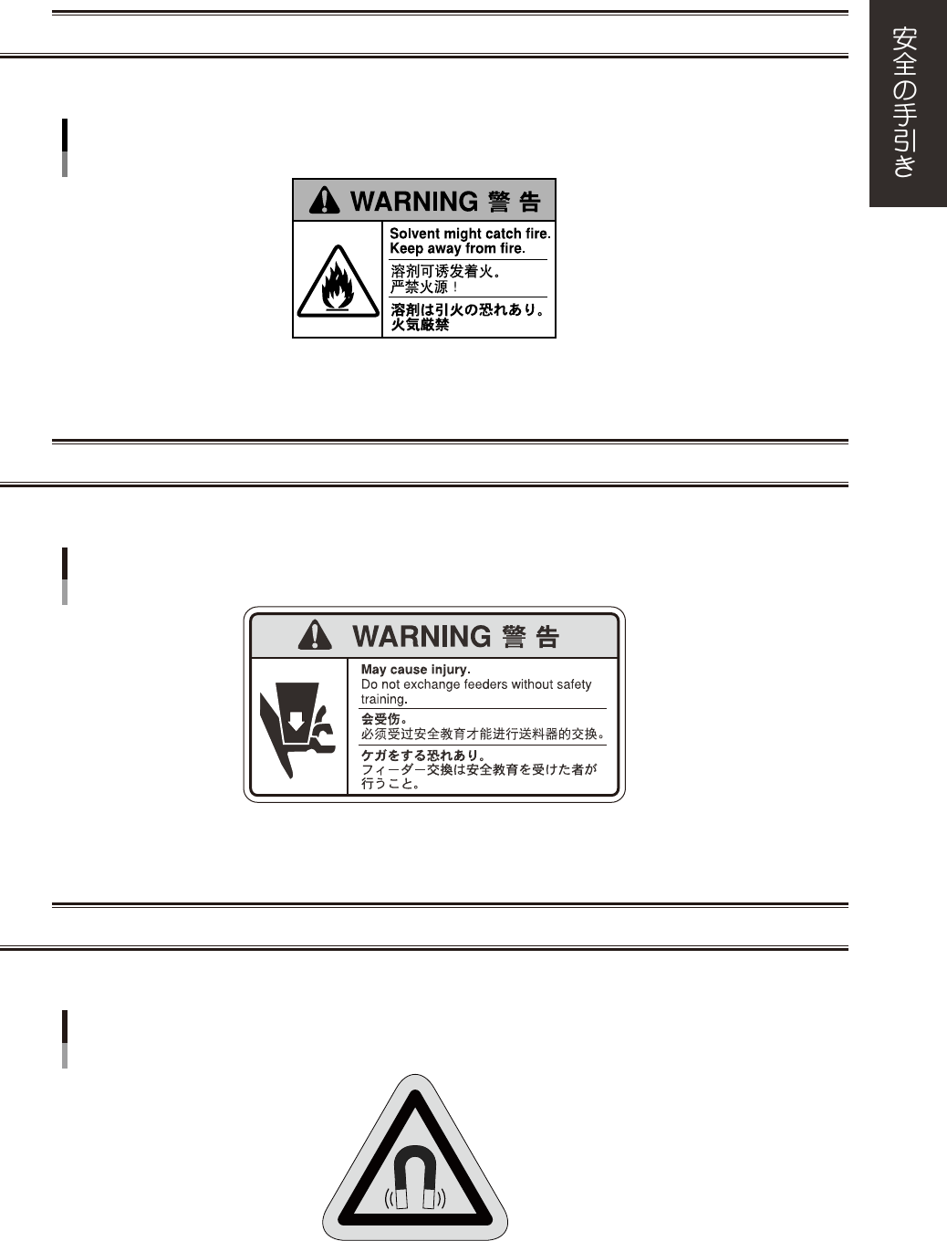 xii ■警告内容 w 警告 マガジンを取り扱う際、手などを絶対にマシン内に入れない。可動部に手や指を挟まれてケガをする恐れがあります。 ■ 対象マシン トレイチェンジャー(YG シリーズ ) 挟んでケガをする恐れあり 90K41-000470 ■警告内容 w 警告 放電針に手を触れない。分解しない。水をかけない。感電する恐れがあります。 ■ 対象マシン マウンター全マシン 可造成触电和故障的原因。 别用手触摸电极…