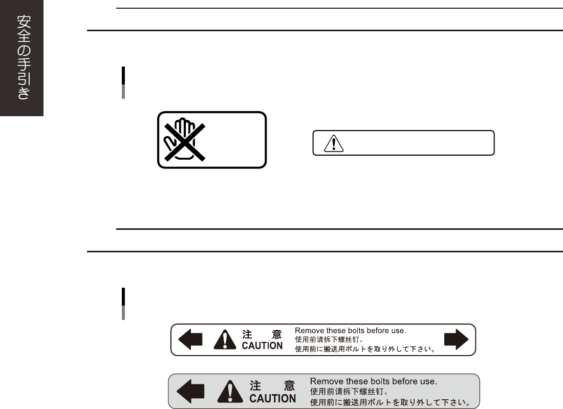 xvi 3.2.2 機械の破損、ダメージ ■注意内容 c 注意 カメラユニットに触ったり、衝撃を与えると実装に影響しますので注意してください。 ■ 対象マシン 全てのマシン DON'T T OUCH DO NOT T OUCH カメラユニットに触らない 91111-LC-00 ■注意内容 c 注意 使用前には搬送用ボルトを取り外して下さい。取り外さずに使用すると破損する可能性があります。 ■ 対象マシン …