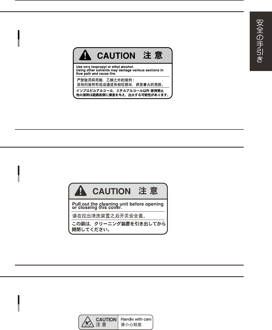 指定外の溶剤を使用すると、機械へのダメージおよび出火の原因となりますので注意してください。