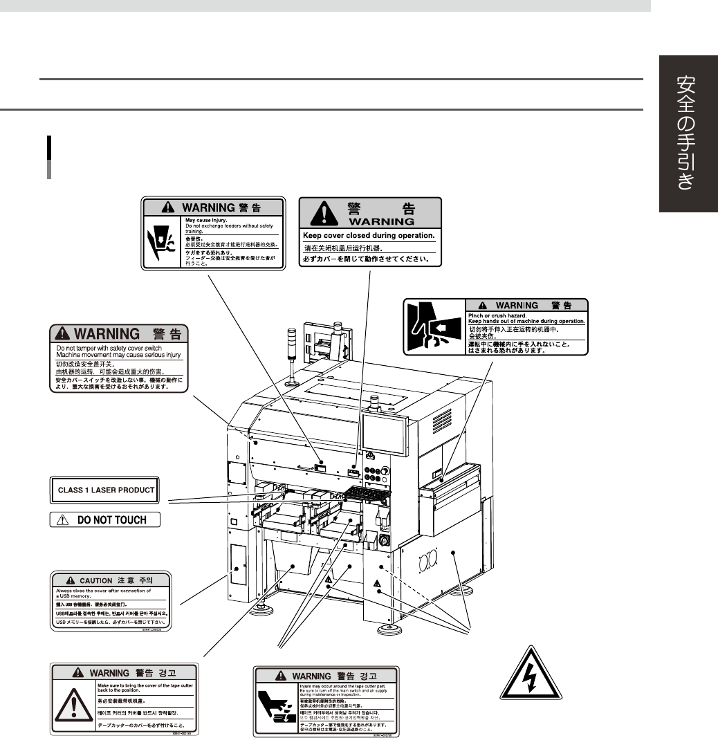 xix 3.3 ラベル貼付け位置 製品を正しく安全にご使用いただくため、本体各部に下記のような警告表示をしています。常に正しく読める ようにしていただき、この警告表示内容を遵守してください。 n 要点 機種により多少ラベルの内容および貼付け位置が違いますが、基本的には下図の場所に貼付けられています。 警告表示ラベル YS12正面 ■ 開閉カバー内部 ■ フィーダーセット部 ■ コンベア開口部 (左右) ■ カッター部 ■ カッターダク…