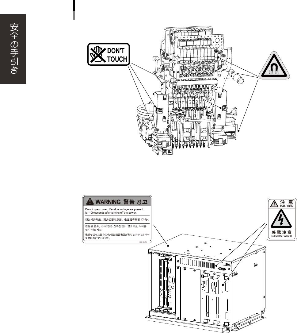 xxi ■ラベル貼り付け位置 警告表示ラベル YG12正面 ■ 開閉カバー内部 ■ フィーダーセット部 ■ コンベア開口部 (左右) ■ 開閉カバー ■ 開閉カバー ■ 下パネル部および内部 ■ パネル内部 91201-M5-00
