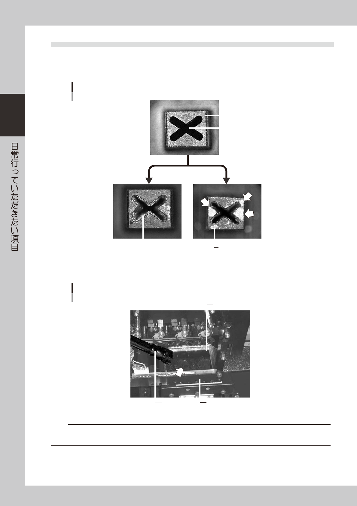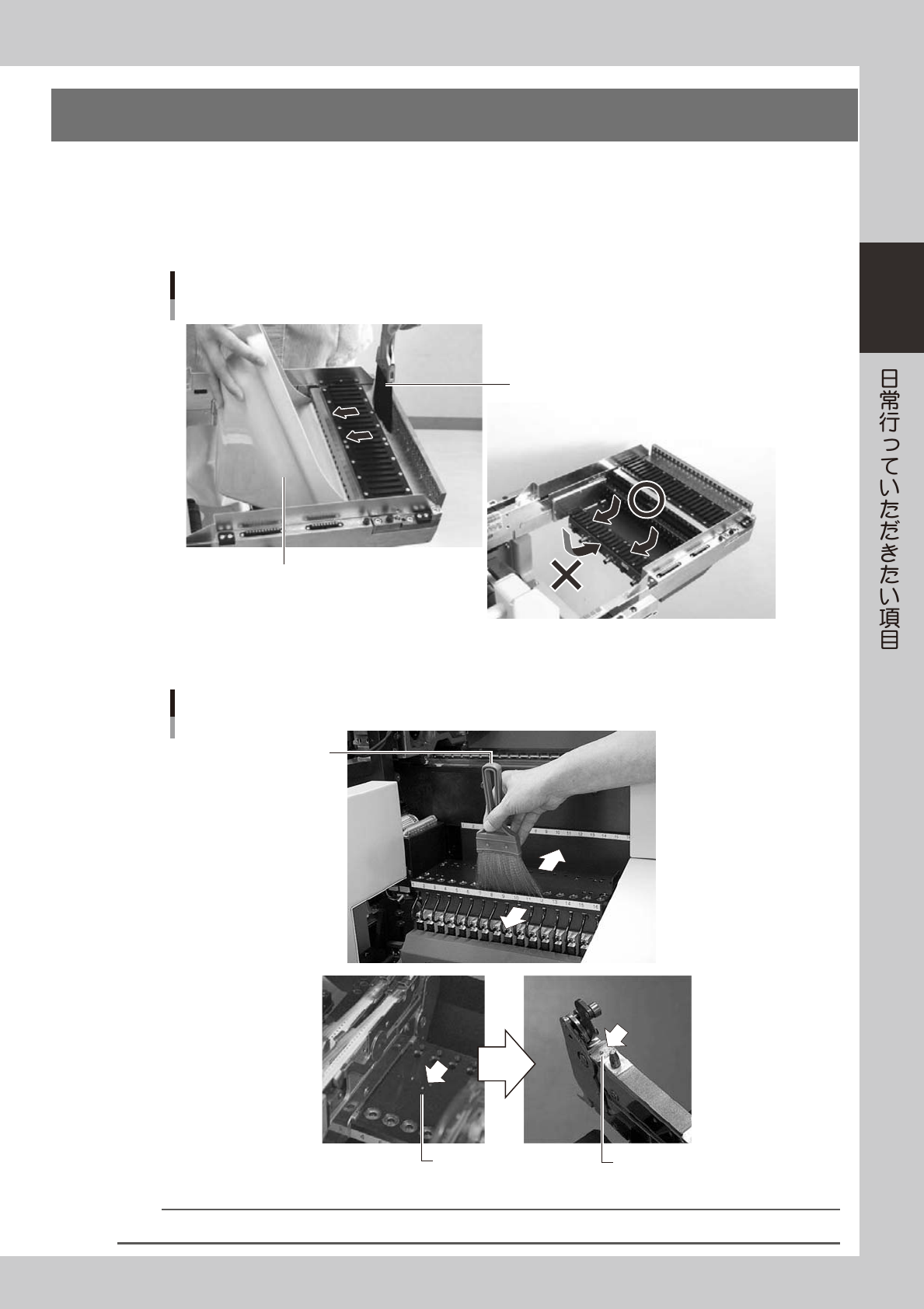 上記の確認を行った上でノズルの汚れまたはノズル詰まりが発見されて場合は、直ちに第 3 章「1.1 ノズルの点検と清掃」の説