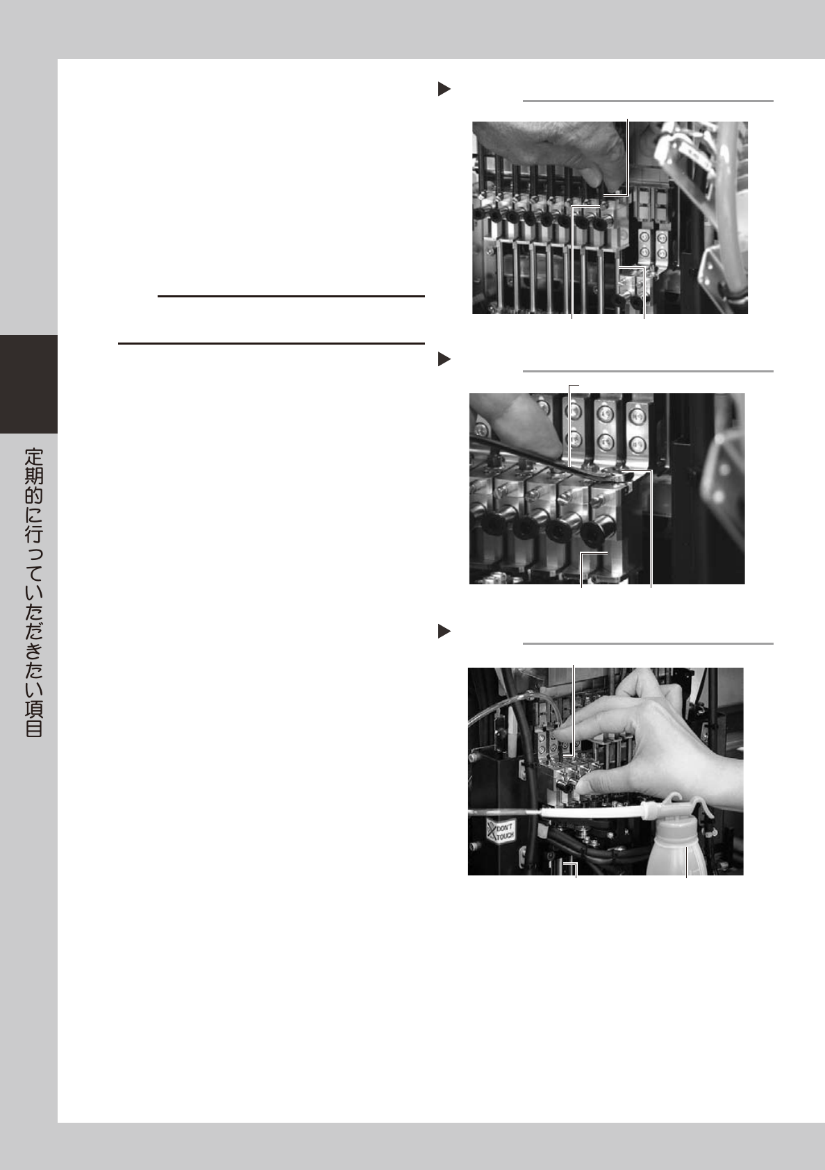 3-19 3 3.2 スプラインシャフト内の清掃・給油 スプラインシャフトのエア経路内に異物が付着したり、汚れなどが付着して吸装着エラー発生の原因となる場 合があります。供給エアの状態や可動時間にもよりますが、通常 3 ヶ月程度でスプラインシャフト内を清掃し てください。 c 注意 スプラインシャフトの作動が不安定動作や異音等発生した場合には販売代理店もしくはヤマハに連絡してください。お客様での 分解清掃は保障の対象外となります。 …
