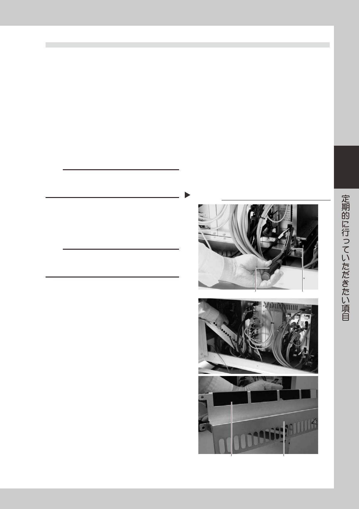 3-31 3 4.5 コントローラー用フィルター点検・清掃 ( 1年) コントローラー内部の基板を冷却するためにコントローラーの下部にはファンが付いており、主電源が入って いるときは常時エアを取り込んでいます。ファンで取り込んだエア内の埃はフィルターで除去しています。 埃が溜まると正常に動作しない場合がありますので、定期的にフィルターの清掃を行ってください。 1 供給エアとマシンの電源を切ります。 ソフトウェアを終了してマシンの電…