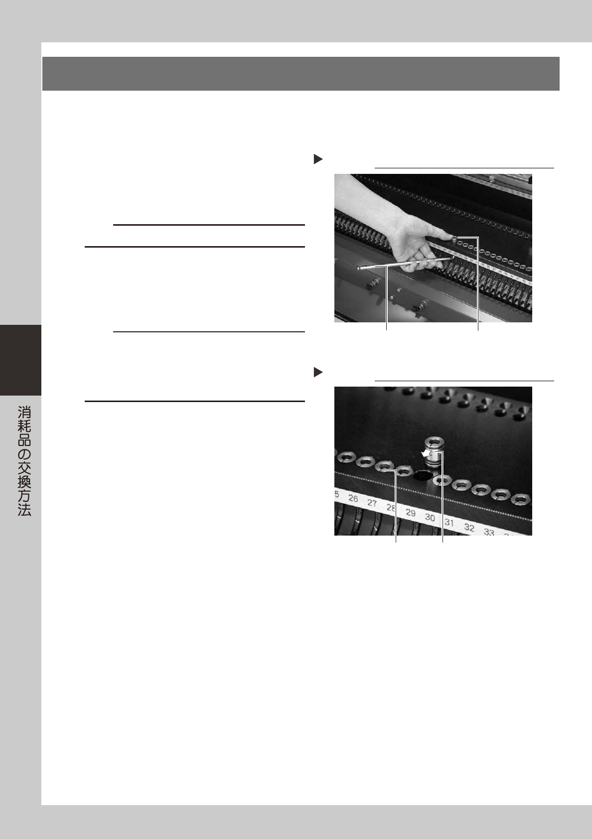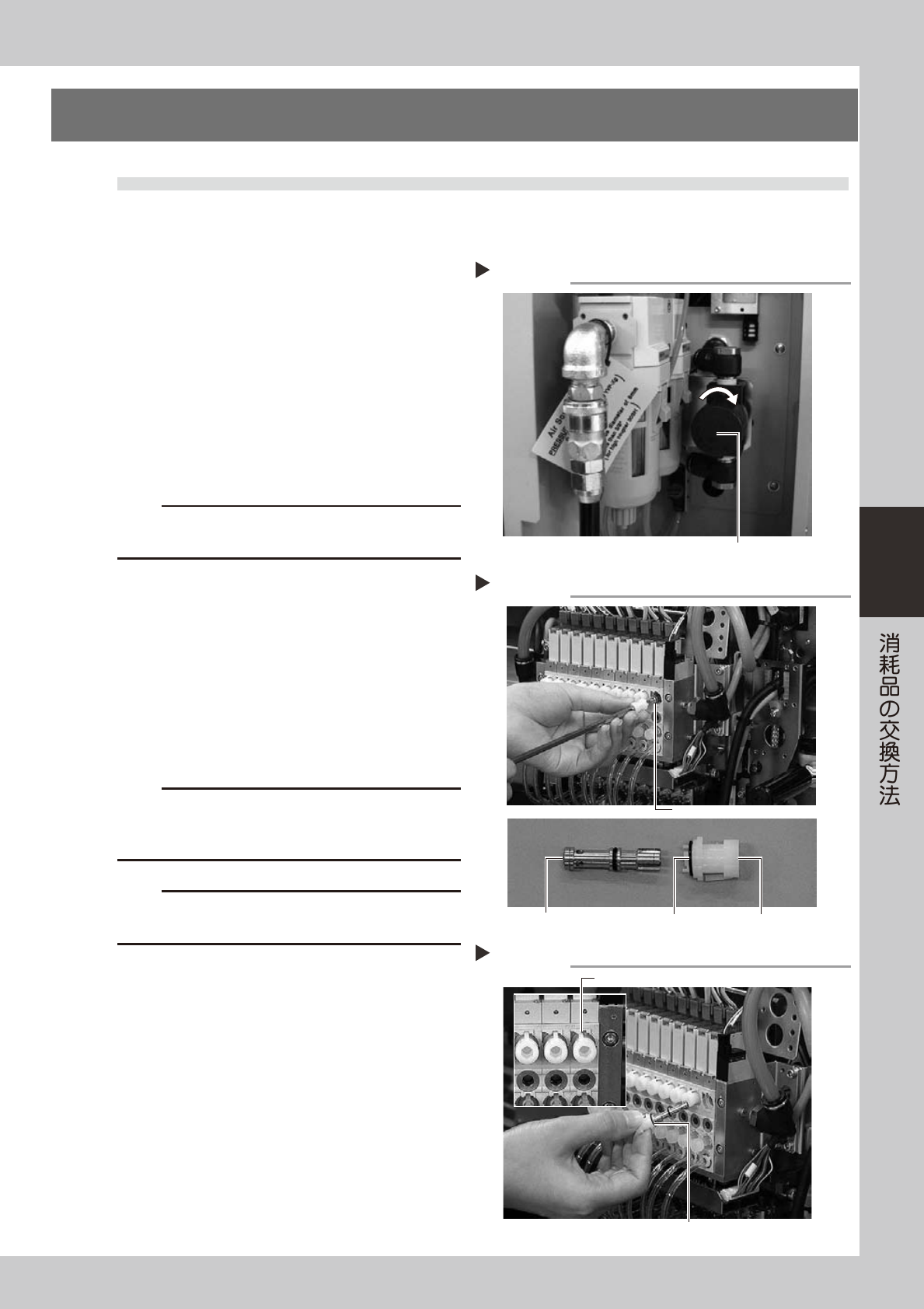 4-3 4 3. エジェクター部 3.1 エジェクター BIT の交換 1 供給エアを切ります。 マシン左下パネル内の「エア供給 / 排出」バルブ を右に回してエア供給を止めてください。 51346-L5-00 2 ヘッドを作業しやすい位置に移動しま す。 3 BIT を手で引き抜きます。 キャップを 6 角レンチで左に回して取り外してく ださい。BIT の先端が見えますので手で引き抜い てください。 51424-L5-00 c…
