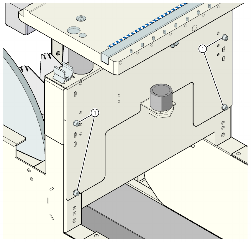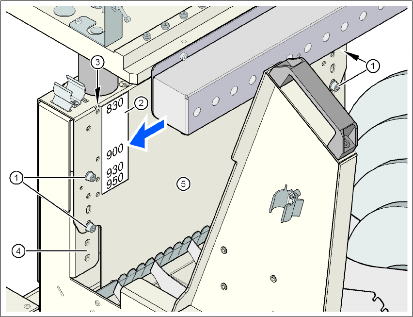 사용자 매뉴얼 SIPLACE D4i 4 셋업 및 시운전 소프트웨어 버전 SR.605.03 SP2 에서 업데이트 10/2 012 영문판 4.4 PCB 컨베이어 높이에 맞게 컴포넌 트 트롤리 조정 179 4.4 .5 900m m PC B 컨베이어 높이 4 그림 4.4 - 4 컴포넌트 트롤리 : PCB 컨베이어 높이 900 mm - 뒷모습 , 6 각 소켓 헤드 나사 및 점검구의 위치 (1) 6 각…