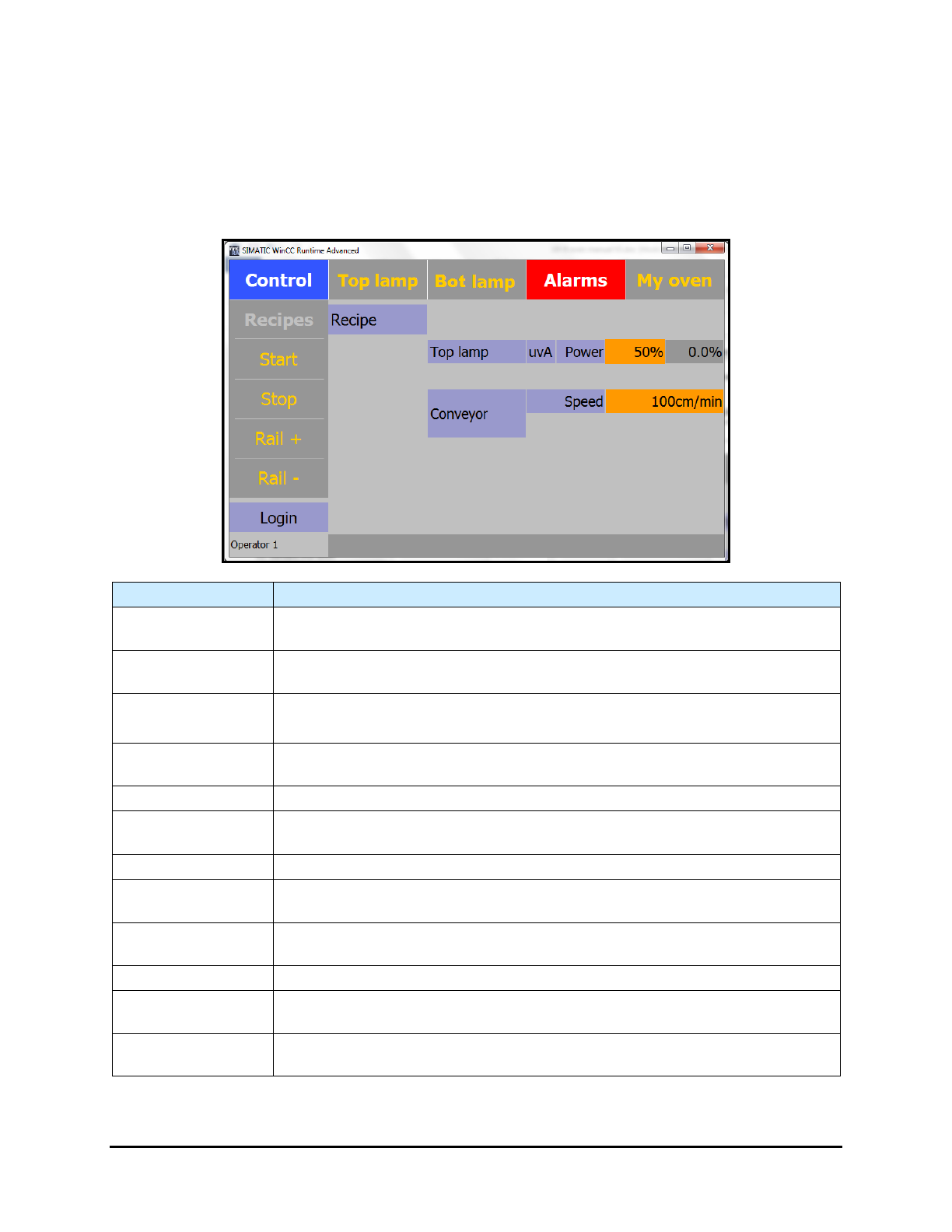 Adjusts the conveyor width. Click on Rail + to widen the distance between the
