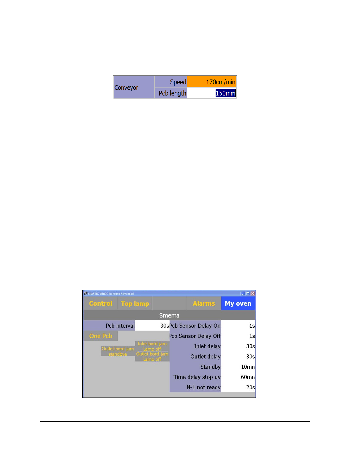5.7.4.9 Board Jam Detection Screen (Option) This option detects a board ja m at the entrance or exit of the UV -9 Cure Module . The alarms sounds if the entrance and/or exit sensor detects a board after the PCB Sensor De…