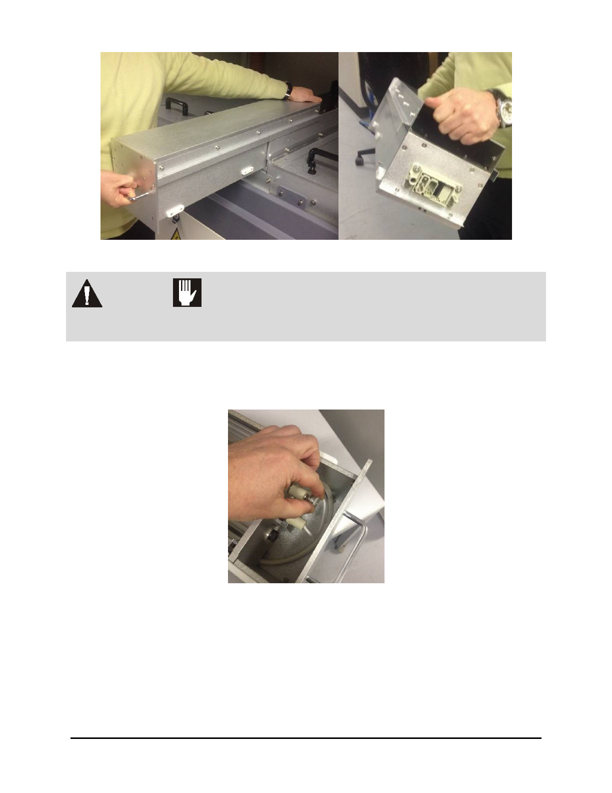 Figure 6-4 Holding the Module WARNING! CAUTION! DO NOT touch the lamp o r reflector. The sur face may be hot. To prevent burn injuries, hold t he module a s shown in Figure 6-4. 7. Place the UV lamp module on a work benc…