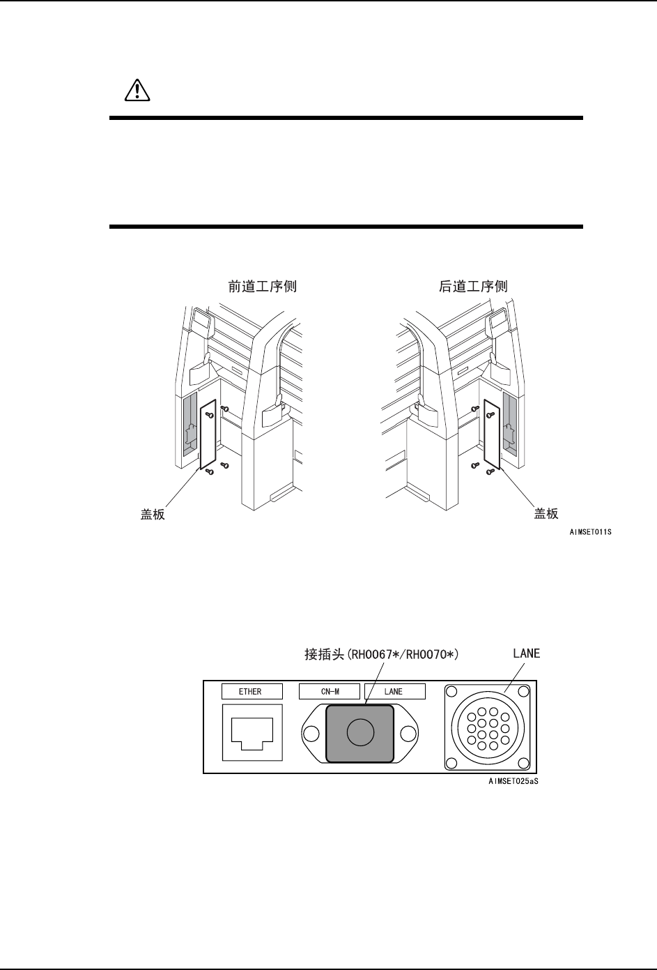 3. 机器的安装 QD045-03 32 AIM 安装手册 连接方法 1. 拆除 Side1 侧 的盖板。 2. 在前道工序电路板搬运 I/F 箱和后道工序电路板搬运 I/F 箱的 LANE 接插头上安装连接电 缆。 3. 在前道工序电路板搬运 I/F 箱的 CN-M1 和后道工序电路板搬运 I/F 箱的 CN-M 2 上保留安 装的接插件 (RH0 067*/RH0070*) 。 4. 将连接好的电缆 (前后各 1 根) 从基座下取出…