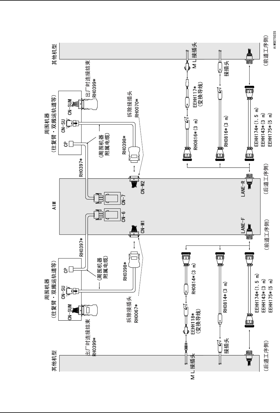 QD045-03 3. 机器的安装 AIM 安装手册 43 5. 将前侧周 围机器附属的信 号用电缆( RH0397*) 从机 器基座下的孔插入 到基座中, 连 接到 制动箱的接插头 (CP1CN6)上。 6. 将前侧周围机器附属的信号用电缆从机器基座下的孔插入到基座中,连接到制动箱的接 插头 (CP1CN7)上 。 7. 保留安装 在周围机器的 CN- SUM 上的接插件 (RH0 399*) 。