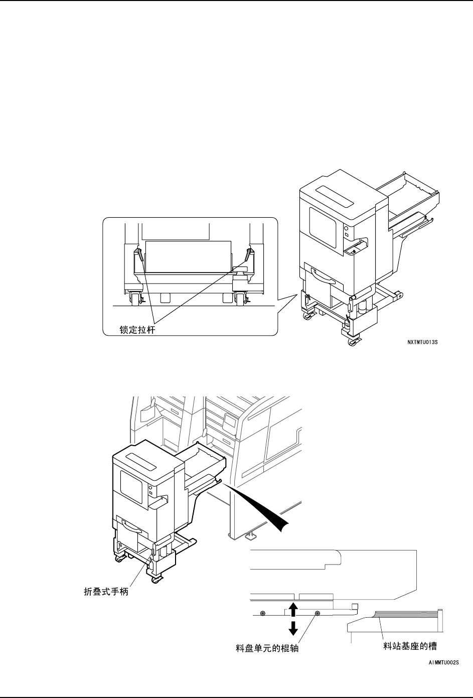 2. 旋转折叠式手柄,使料盘单元 -L 的滚轮与模组端料站基座槽的大致高度相对齐。