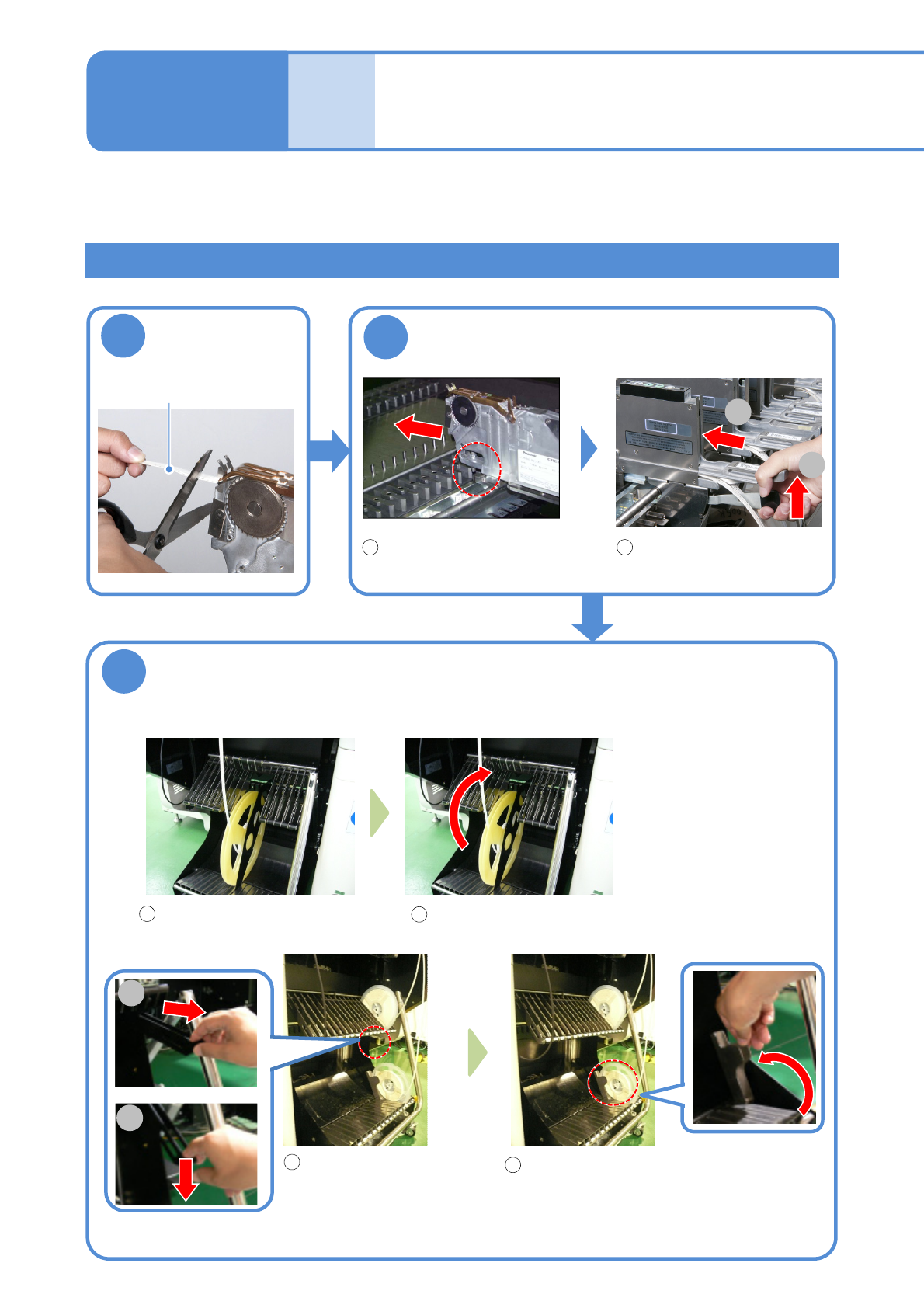 NPM-D3 EJM6DC-MB-02O-02 离线 准备 智能供料器的准备 1 2-4-1 -1 操作篇 2-4-1 2 1 剪断载体编带 把料架安装在料架座上 料架的前端对准插槽插入。 3 把杆往上拉,然后推到里 面。 载体编带 安装卷盘 ■大卷盘 把卷盘放在下段的曲面上。 确认卷盘是否能够转动。 ●根据邻接的卷盘的设置状 态,安装分离器。 ●对较重的卷盘,插入棒芯。 ( → P. 2-4-1-5) ■小卷盘 放置卷盘。 拉起杆直到…