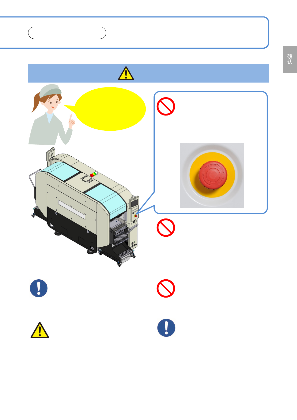 NPM-D3 EJM6DC-SF-01N-0 2 未经专门培训者请勿 进行操作、调整、修 理 ( 错误操作、错误调整、错误修理可能造成 受伤 ) ●培训情况请与本公司联络。 正确安装地线 ( 故障或漏电时,可能触电 ) ●请与专门的电力公司联络。 有电气贯通的部分, 请勿用针类金属等导电体碰触 ( 可能触电 ) ●连接器或端子等的通电部 小心高温 ( 可能烫伤 ) ●贴有此标记的警告标牌部分,可能 是高 温状态。 ●运转停止后,也有可能…