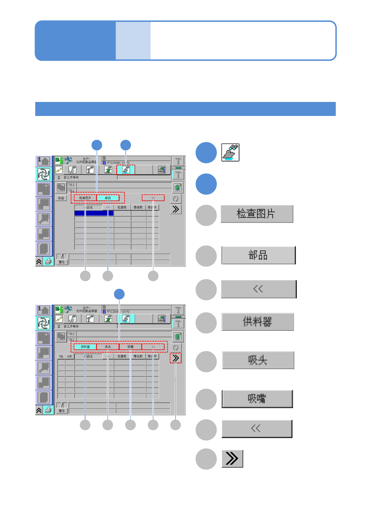 NPM-D3 EJM6DC-MB-04O-02 生产 4-4-3 -1 检查监视器 1 操作篇 4-4-3 在生产中画面或者生产信息菜单,以生产线整体或者 单体可以确认收集在 LNB 的错误信息。未连接 LNB 时,不 能显示信息。 1 A B 显示元件单位的检查结果信息。 C 显示下一页。 D 显示料架单位的检查结果信息。 E 显示检查头单位的检查结果信息。 2 选择表示项目 F 显示吸嘴单位的检查结果信息。 G 显示前一页。 H 显…