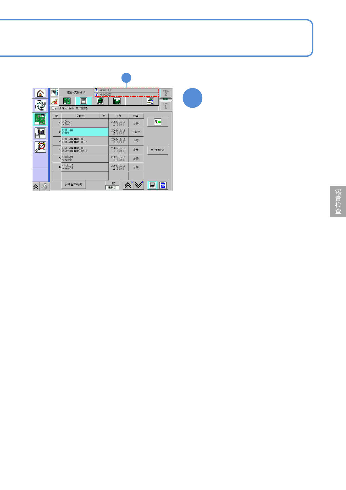 NPM-D3 EJM6DC-MB-05O-02 5-3-2 -1 为了在「 2D 检查编辑器」编辑数据,对使用锡 膏印刷后的基板图像的摄像方法进 行说明。 1 3 2 4 生产数据 和校正 校正基板的摄像 1 操作篇 5-3-2 生产数据的读取 1 ●器件对象切换为 LNB 。 ( 显示在 LNB 一览表登录的数据的文件名 称 ) 选择读取的文件名称 ( 所选择的文件名称变成浅蓝色 ) ●按 [ 日期 ] ,文件名称按照日期 从新到旧 …