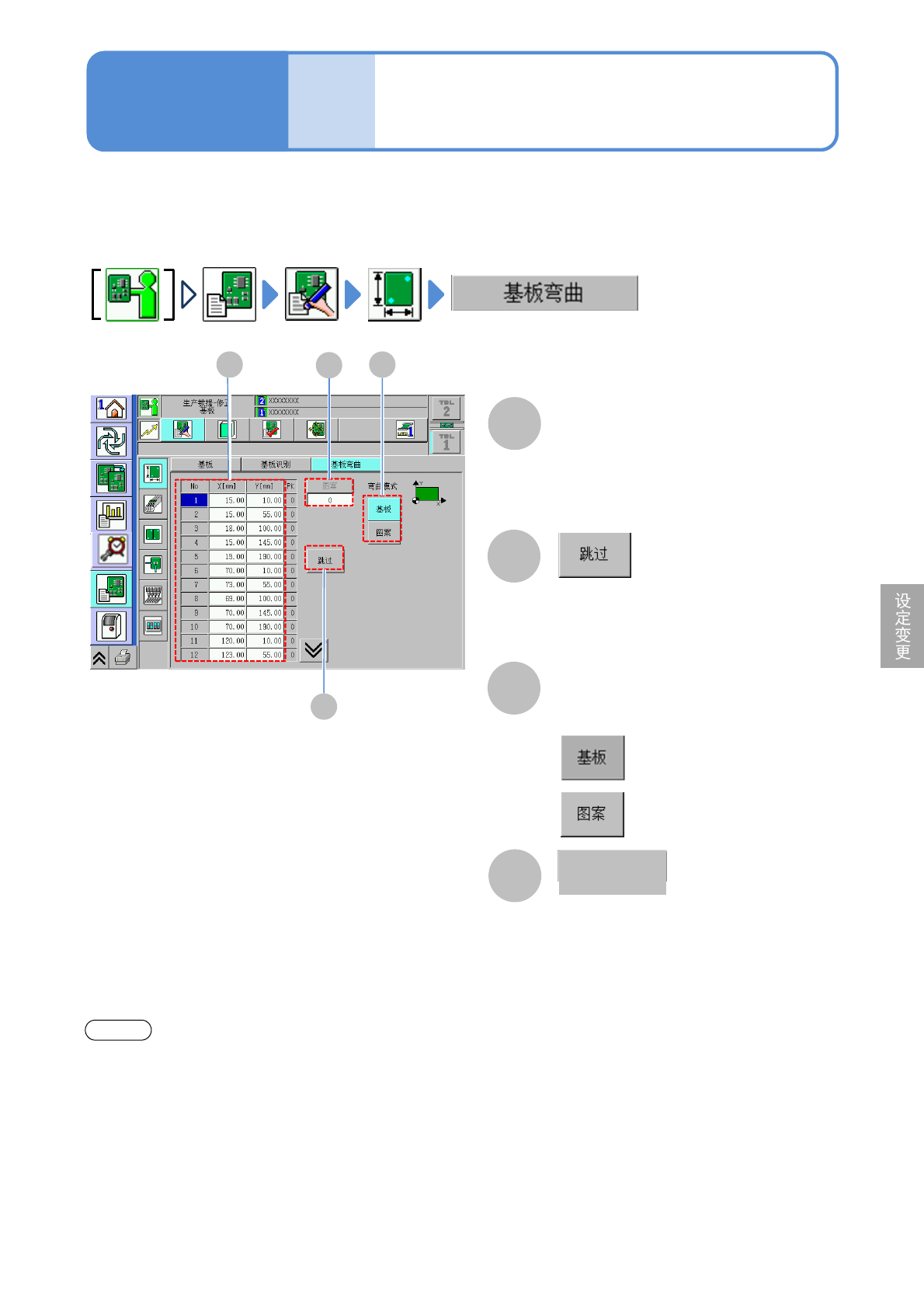 NPM-D3 EJM6DC-MB-06O-0 2 数据 修改 操作篇 6-1-4 C B 跳过所选择的坐标。 ●计测点需要在 9 个点以上。 ●当 在 9 个点以下时,不能跳过。 选择基板弯曲或图案弯曲。 A C A 基板弯曲计测点数据 ( 选购件 ) 弯曲模式 基板弯曲计测点数据 D 能够修改坐标。 在这里对确认、修改基板弯曲计测点 数据的方法进行说明。 请将光标移动到需要变更数据的位置 上后,输入数值。 B D ● X[mm]: 计…