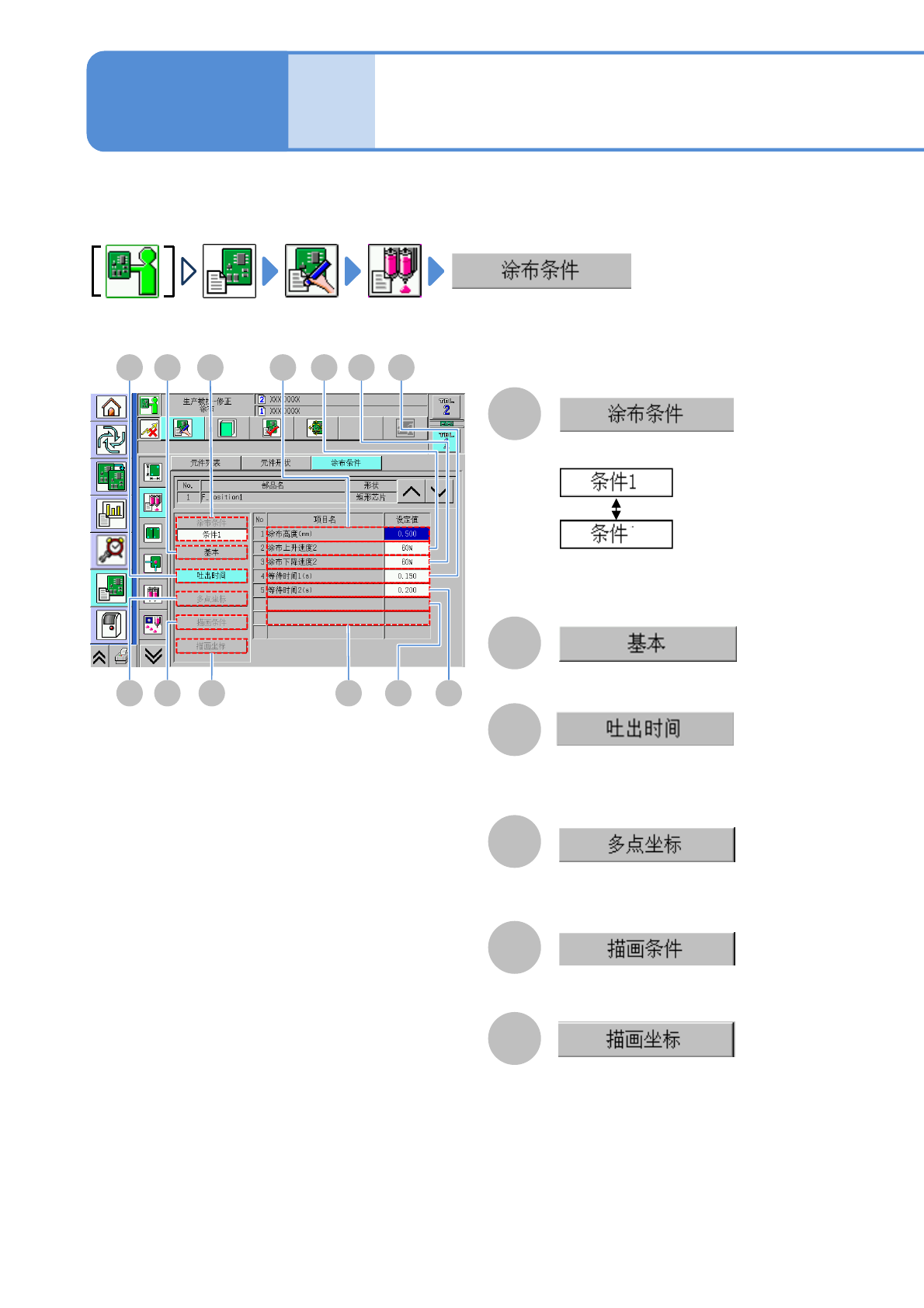 为了在基板上点胶粘着剂的动作条件的表示、设定。