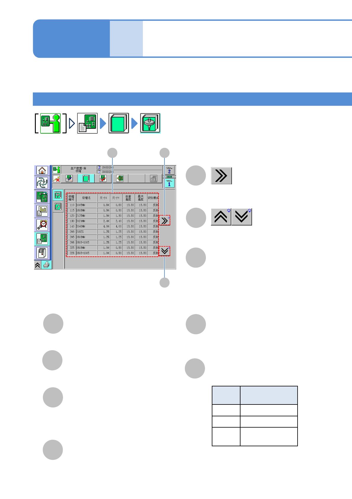 NPM-D3 EJM6DC-MB-06O-02 数据 修改 程序库的确认 1 对可使用的吸嘴和料架信息的确认方 法进行说明。 ●需要编辑时,请通过 NPM-DGS 进行。 吸嘴程序库 ( 贴装头 ) 操作篇 6-1-21 A B H 最大高度 F G 吸着高度 尺寸 X /尺寸 Y C E 吸嘴信息 ( → P .6-1-21 -1 、 -2 ) 吸嘴名 吸嘴的全体高度。 ●单位 :m m 。 从吸嘴上端到吸着面的高度。 ●单位 :m …