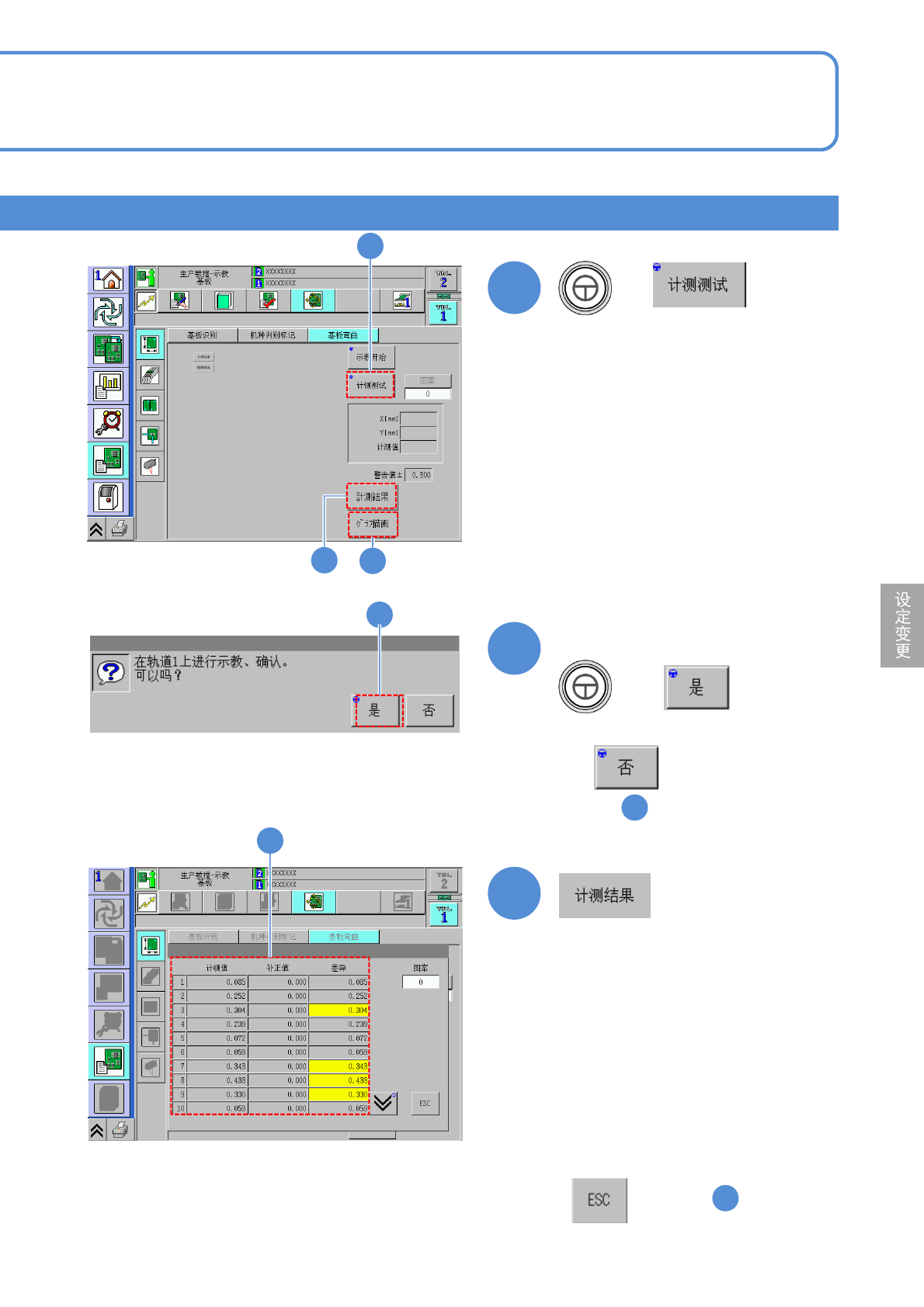 NPM-D3 EJM6DC-MB-06O-02 生产数据 校正 操作篇 6-2-3 6-2-3 -5 基板弯曲计测点校正 3 ( 选购件 ) 8 9 1 2 3 4 5 1.5mm 1.5mm 10 8 9 10 + ( 计测所选择计测坐标和周围的 4 点,并 显示结果。 ) ●确认以下要点 计测点(中心)和周围的差在 0.03mm 以下 ●当计测结果不稳定时 通过微动等操作,调整到符合计测的 位 置后,再次计测四周。 ( 请调整到在□…