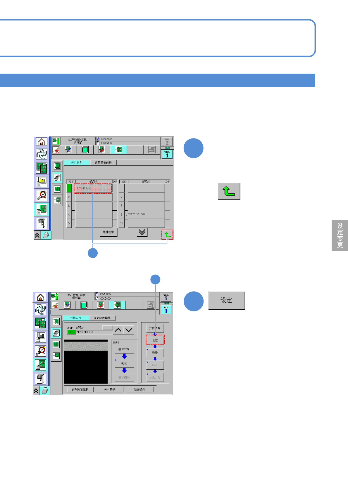 NPM-D3 EJM6DC-MB-06O-02 3 3 ( 显示设定吸着条件的画面 ) 选择识别元件 2 ■停止时 6-2-4 -4 2 ●在“ ADR ”中以绿色显示的栏,表示 需要进行元件识别校正的项目。