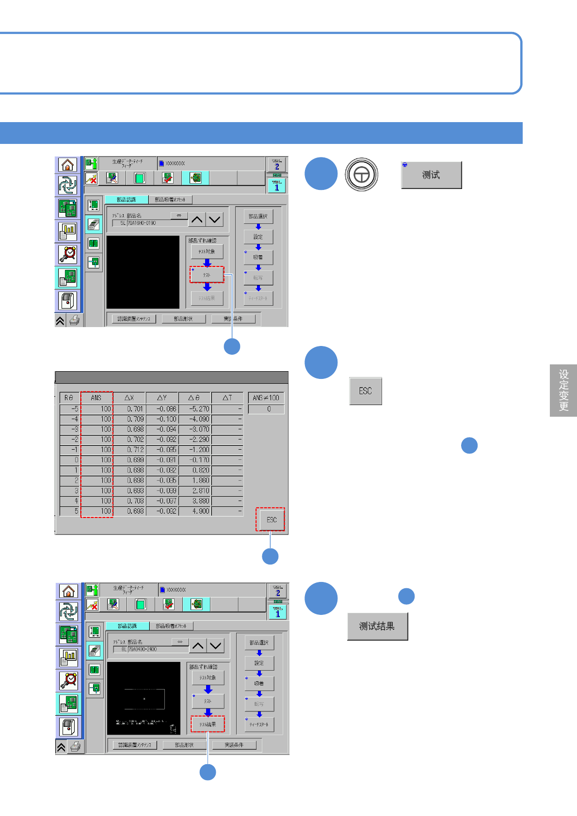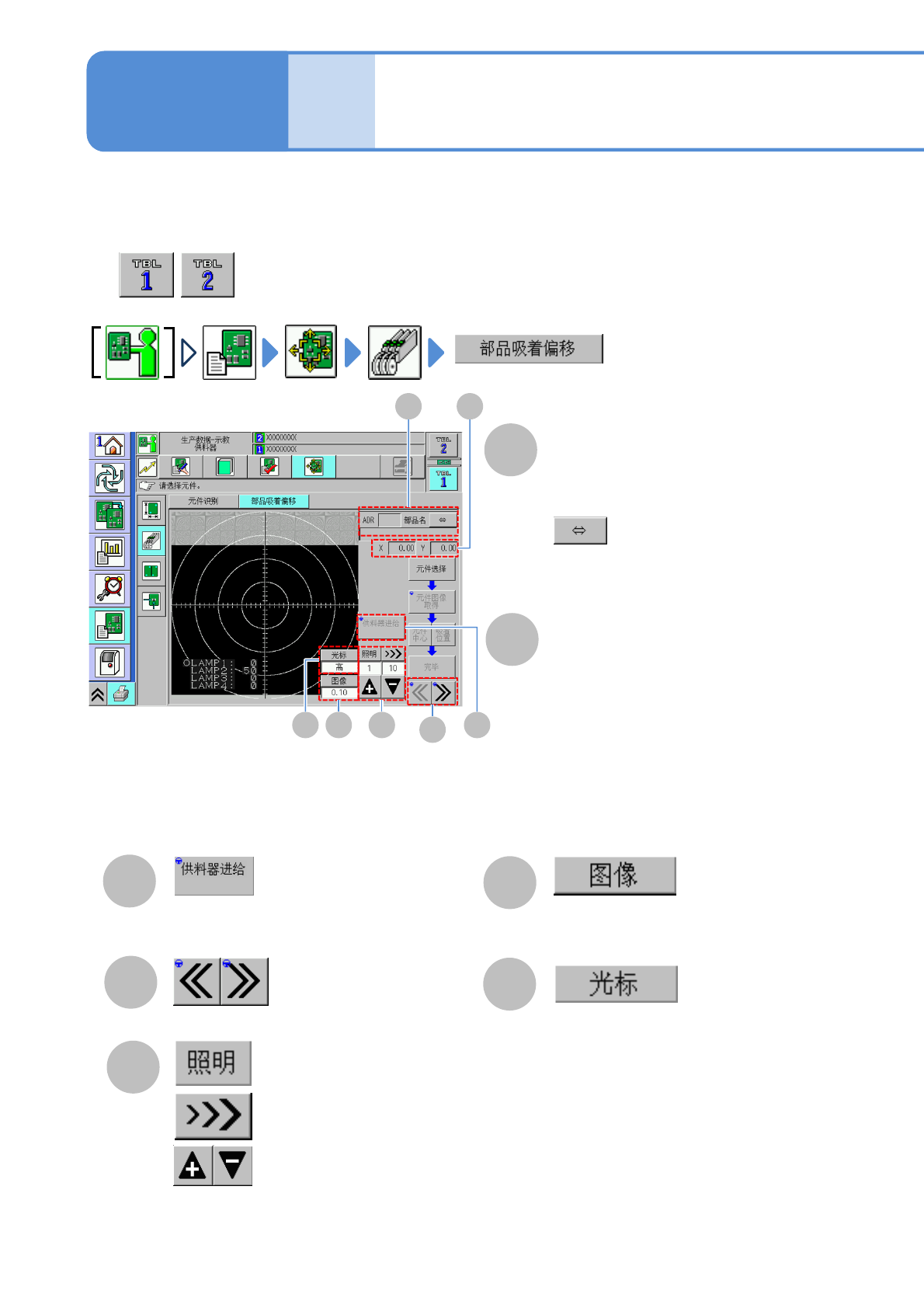 NPM-D3 EJM6DC-MB-06O-0 2 生产数据 校正 操作篇 6-2-6 6-2-6 -1 元件吸着偏移校正 1 进行吸着位置的校正。本功能还可用 于吸着位置与中心位置不同的元 件。 指定元件的中心,然后指定实际的吸 着位置。 ● 都需要进行。 C A B G E F D ADR 配置有料架的插槽编号 ( 地址编号、配置位置 (L/R)) X,Y X 、 Y 的移动量 执行料架的供给动作 切换进行调整的照明 指定图像的移动量…