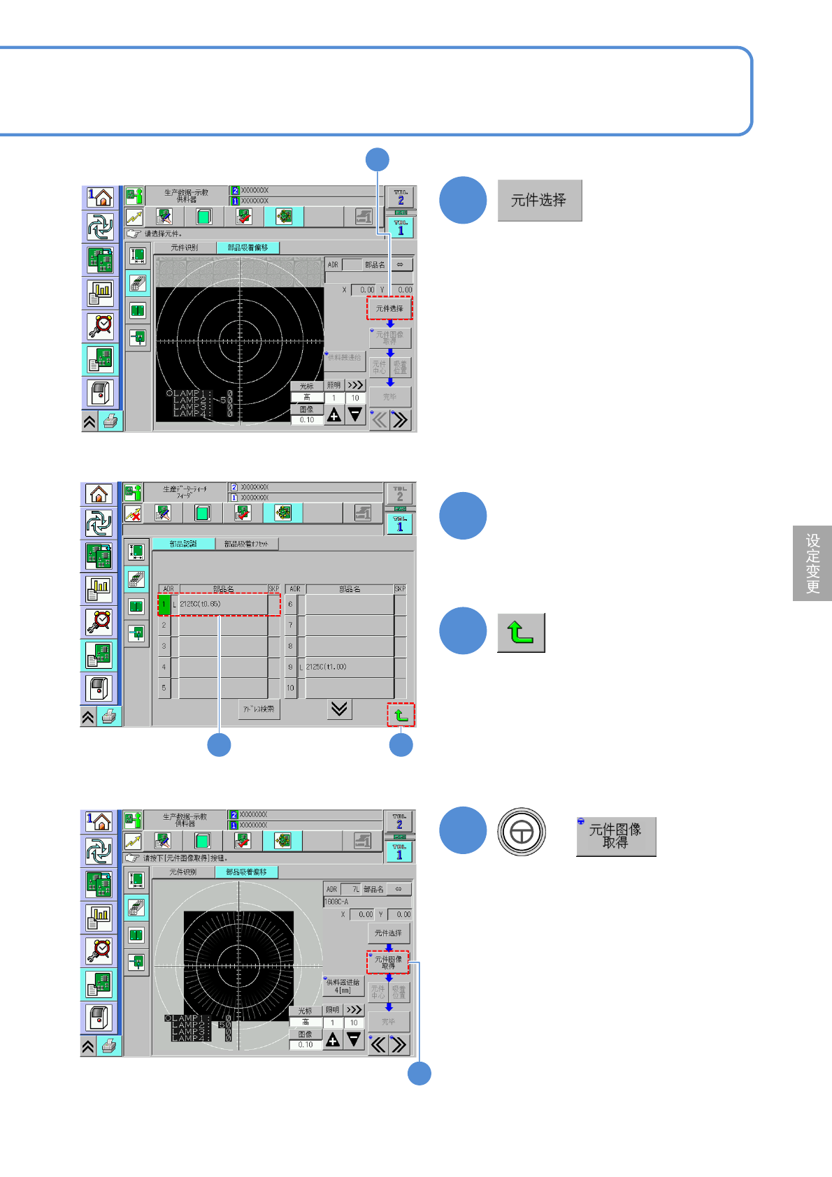 NPM-D3 EJM6DC-MB-06O-0 2 生产数据 校正 操作篇 6-2-6 6-2-6 -3 元件吸着偏移校正 2 6 6 7 7 5 5 请通过位置微调指定元件中心位置。 请通过刻度移动按钮指定实际吸附的 位置。 刻度移动按钮